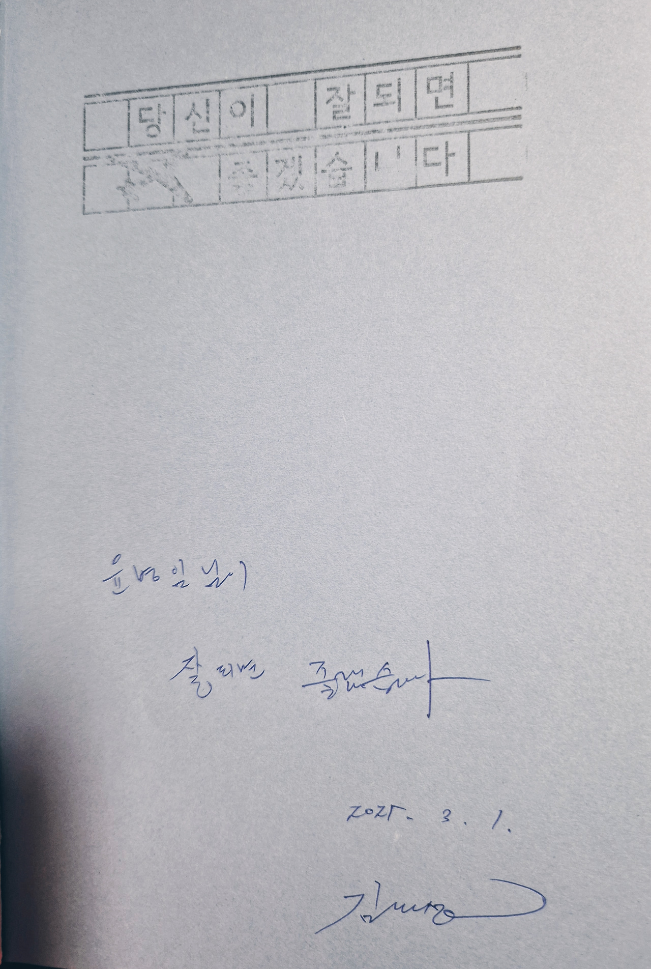 강릉에 도착해서 이곳저곳 둘러보고 마지막 멤버, 석환이까지 합류한 시간이 저녁 9시. 다 같이 모여 늦은 저녁을 먹고 두런두런 이야기꽃을 피운다. 무엇보다 내일 김민섭 작가님을 만날 생각을 하니 뭔가 준비해야 할 것 같다는 생각에 일단 책 내용부터 확인한다. 책을 읽은 사람들이 한 명씩 돌아가며 <당신이 잘되면 좋겠습니다> 에피소드를 정리해서 말한다. 아직 책을 못 읽은 사람을 위한 속성과외를 시작한다. 헌혈을 주기적으로 하게 된 사연, 비행기표 환불대신 동명이인 김민섭을 찾아가는 여정과 그를 둘러싼 훈훈한 이야기, 교통사고가 고소로 이어지는 이야기, 눈물겨운 다이어트 챌린지 성공기까지. 책 내용을 쭉~훍고 복습하니 왠지 든든하다. 그리고 자연스럽게 질문과 소감들을 주고받는다.