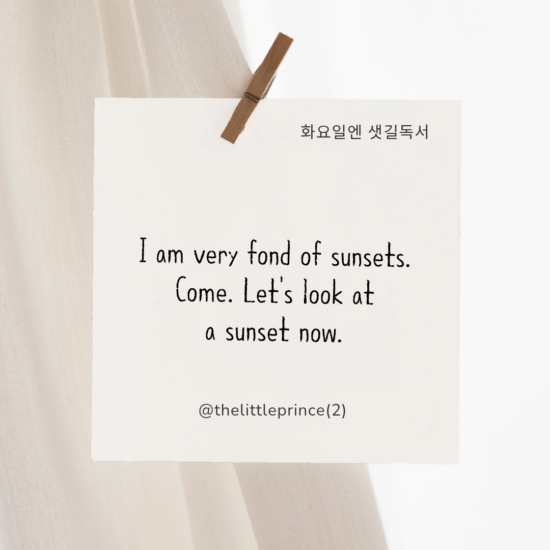 어린 왕자는 석양을 좋아한다. 그의 작은 행성에서는 의자만 옮겨 위치를 달리하면 하루에도 수십 번 석양을 볼 수 있다고. 언젠가 그는 하루에 43번이나 석양을 본 적도 있다며 석양에 대한 깊은 사랑을 드러냈다.