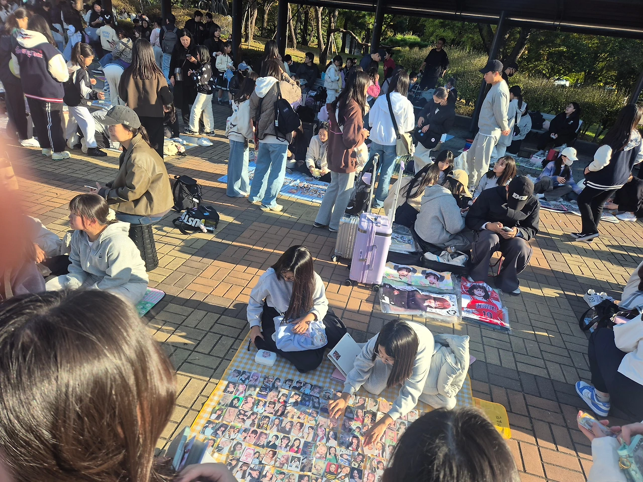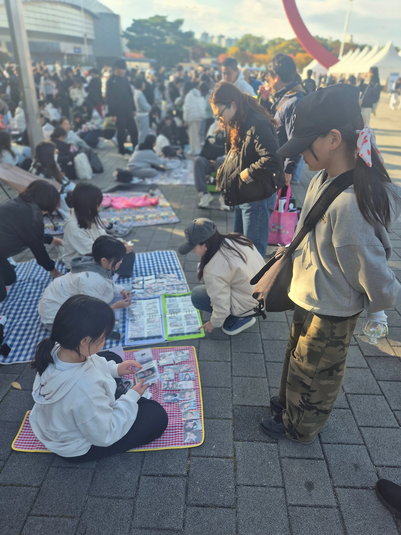 배부르게 점심을 먹고 한숨 돌리니, 이제 포카교환하러 가야 한다고 딸내미가 새로운 오더를 내린다. 참으로 알찬 일정이다. 털레털레 딸 꽁무니를 따라 공연장 앞에 가니 넓은 공터에 빽빽이 들어앉은 사람들, 초5막내딸과 비슷한 또래의 아이들이 작은 돗자리를 펴고 포토카드를 쭉 널어놓고 영업 중이다. 수줍은 우리 딸, 한참을 둘러보더니 포카 판매 중인 작은 소녀 곁에 조심스럽게 다가간다.