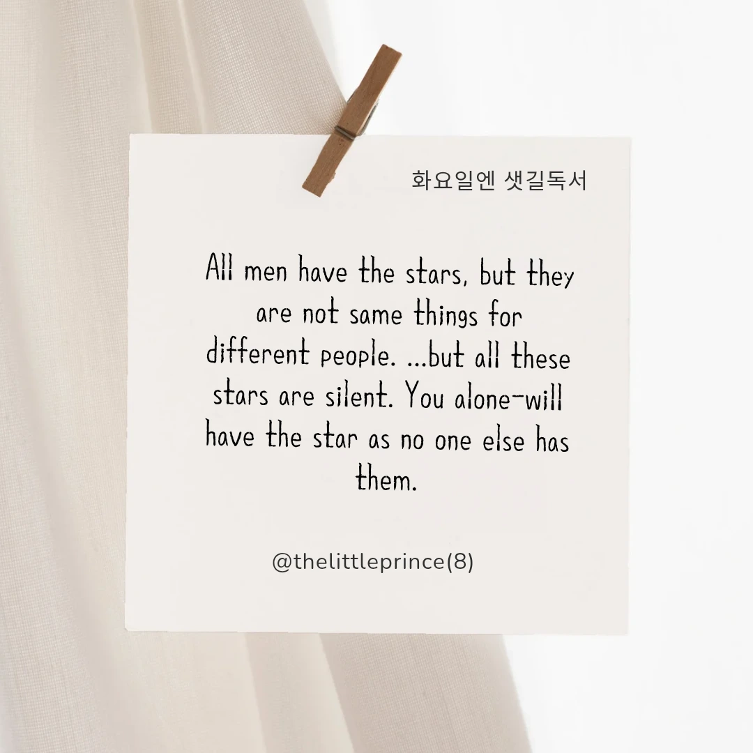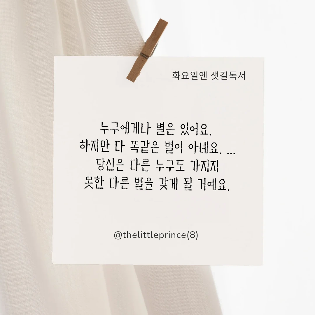 <화요일엔 샛길독서> 어린왕자 첫 번째 연재가 끝났습니다. 그간 <어린왕자>와 함께 하는 샛길독서 여정을 함께 해주신 독자님들께 감사드립니다. 조금 쉬었다가 주옥같은 고전과 함께 하는 샛길독서로 다시 돌아오겠습니다.