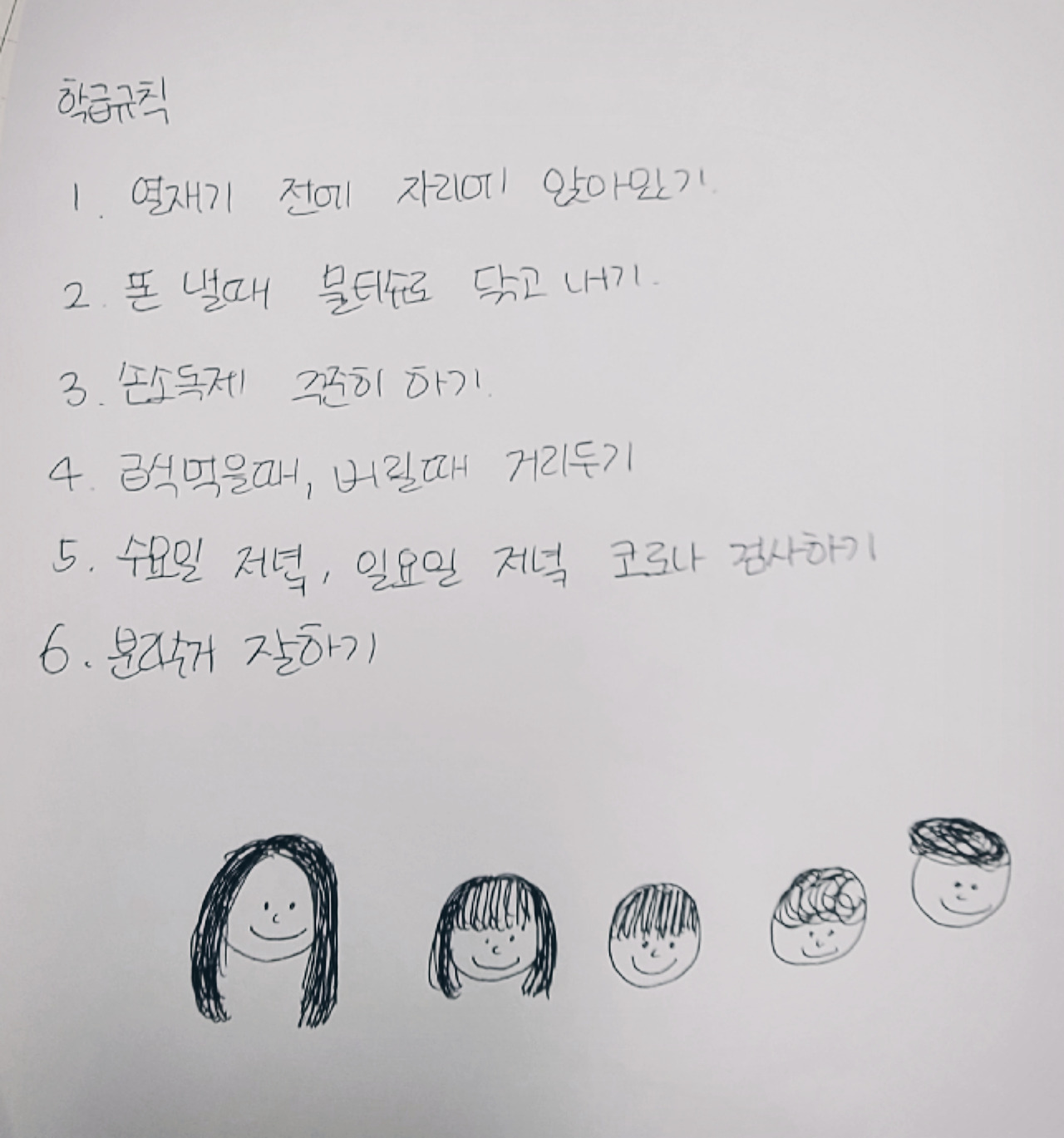 정해진 규칙은 일주일 동안 매일 아침 조회시간에 부서장이 나와 발표하고 공유한다. 그리고 4월 자리배치는 모둠원끼리 같은 분단이 되도록 재조직한다.