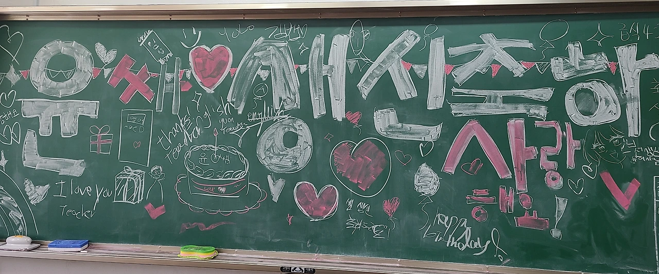 학급 자치의 기본은 적절한 역할분담과 모둠원간의 팀워크. 그리고 입에 착 붙는 부서명 변경으로 이해하기 쉽게 모둠을 만들었다. 원래 있던 부서명: 학습부, 총무부, 미화부... 이런 이름들은 너무 어려운 데다가 노잼이다. 그래서 싹 다 내 맘대로 개명해버렸다. 펀펀 이벤트부는 우리 반 학급 행사와 단합을 추진하는 부서로 제일 처음 생일파티와 마니또를 추진했다. 생일파티는 생일 당일 아침 칠판 가득 축하 메시지를 적고 떼창으로 생일 축하노래 불러주기. 그리고 인증샷까지도 꼼꼼히 챙긴다.