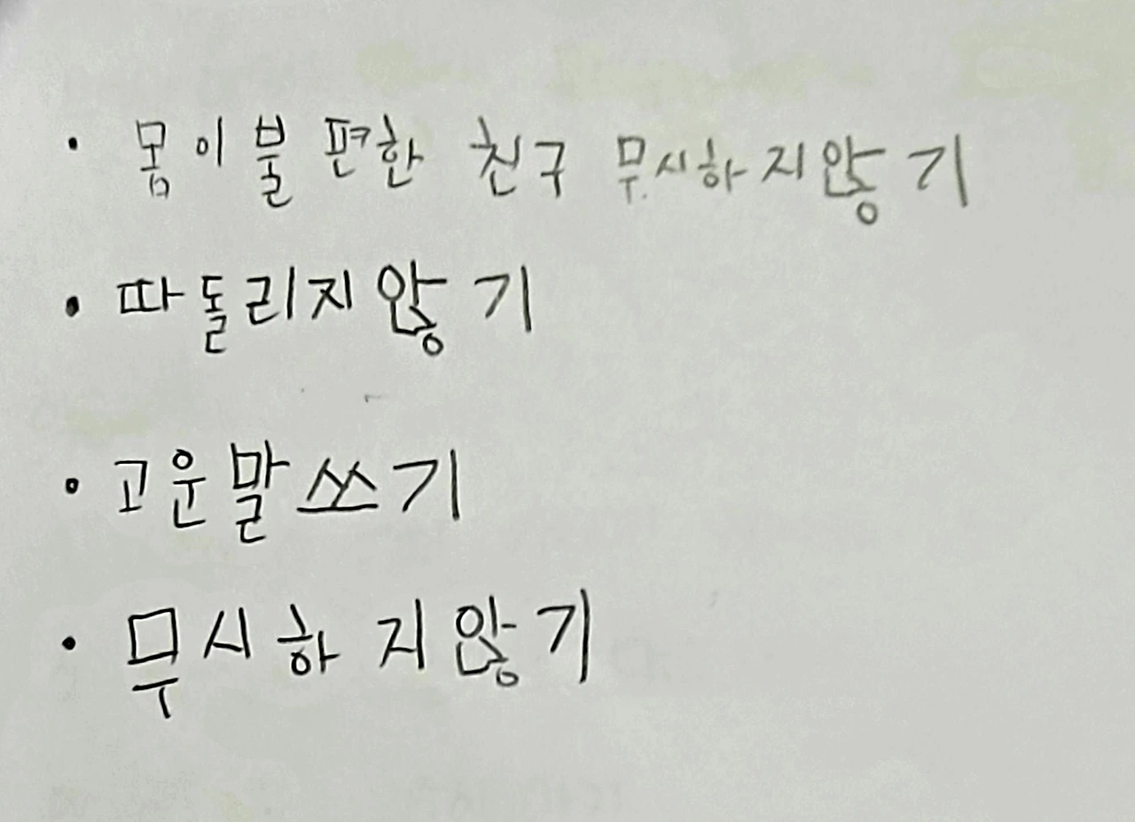 꼼꼼 학습관리부는 수행평가나 시간표 변경, 준비물을 챙겨 칠판에 적어주고 반톡 공지도 해주는 부서다. 튼튼 건강관리부는 코로나 시대에 새로 생긴 부서로 손소독제 관리, 소독 물티슈 배부, 체온 체크, 교실 환기 등을 담당한다. 핫핫 우정 관리부는 내가 만든 부서중 가장 애정이 가는 부서다. 도움이 필요한 친구나 소외된 친구들을 살피고 먼저 다가가 안부를 묻고 말을 거는 부서다. 반톡에서 욕설이나 같은 말을 반복해 도배하는 친구들에게 경고하는 일도 한다. 친구들 간에 갈등 상황이 생기면 중재해서 서로의 마음을 풀도록 돕는 것도 중요한 미션이다. 마지막 부서는 반짝 교실관리부. 예전의 환경미화부라고 불리던 부서인데 교실의 게시판 관리하고 여러 가지 물품을 정리하고 고장 나거나 수리할 곳이 없는지 살피는 부서이다.