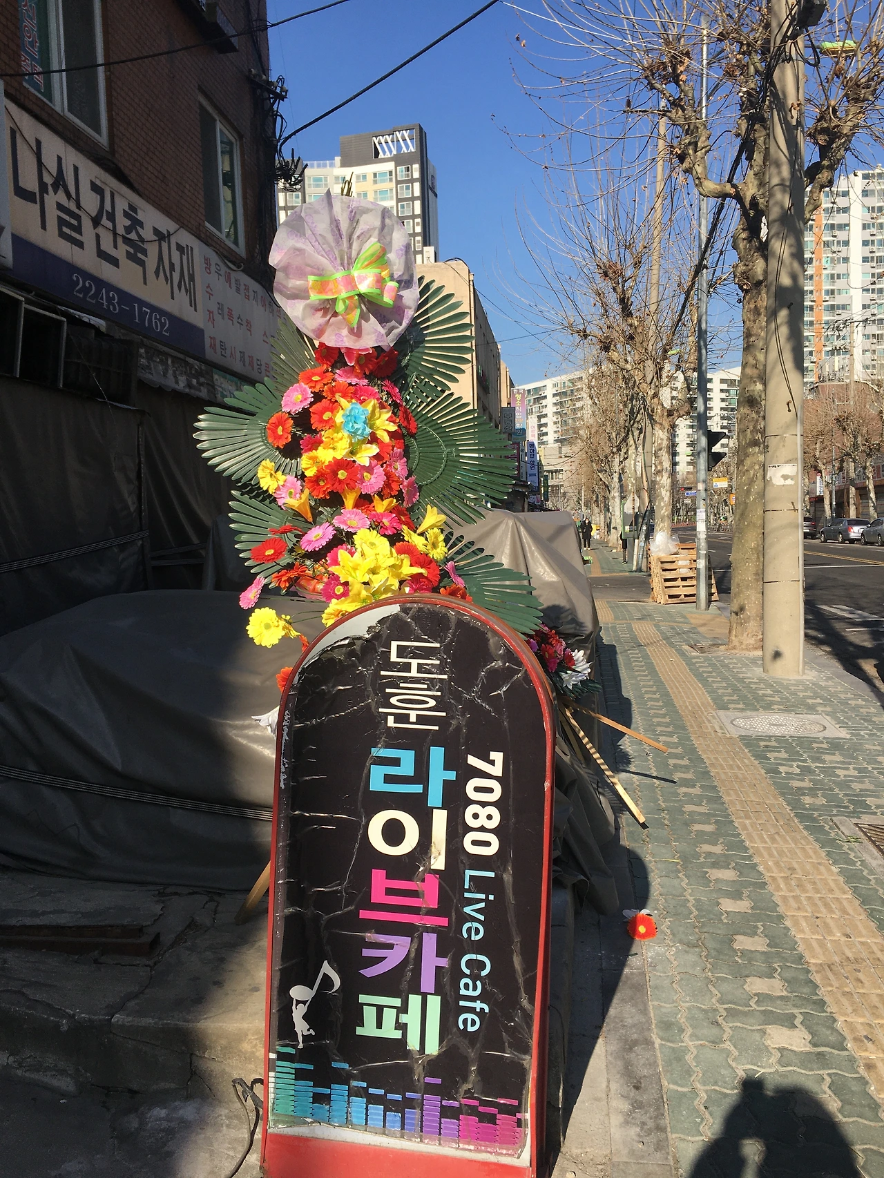 내가 사는 아파트 뒷쪽은 본가와 처가가 있는 신설동을 연상시키는 곳이다. 재개발이 부분적으로 이루어지며 문닫은 가게도 많은데 지금은 열지 않는 라이브카페 입간판 뒤로 화환이 보였다. 이미 쓴 걸 여기에 뒀는지 몰라도 축하화환과 낡은 라이브카페의 폰트를 보고 늘 보던 황학동-신설동 거리가 생각나 찍었다. 달동네에 살때, 황학동 벼룩시장이 집 근처에 있을 때 모두 거기 살지 않는 사람들이 하는 이야기를 듣고 화가 치밀때가 많았다. 잠시 머무는 사람들이 하는 낭만적인 이야기, 우리에겐 낭만이 아니라 생활이며 그때문에 유입된 사람들의 담배연기, 침, 여타 보기 싫은 것들을 감당해야 하는데.