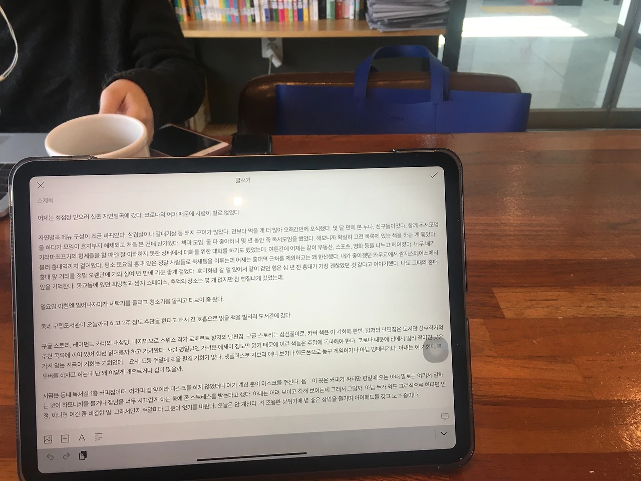 지금은 동네 독서실 1층 커피집이다. 어차피 집 앞이라 마스크를 하지 않았더니 여기 계신 분이 마스크를 주신다. 음... 이 곳은 커피가 싸지만 평일에 오는 아내 말로는 여기서 일하는 분이 하모니카를 불거나 잡담을 너무 시끄럽게 하는 통에 좀 스트레스를 받는다고 했다. 아내는 어려 보이고 착해 보이는데 그래서 그럴까. 아님 누가 와도 그런식으로 한다면 인정, 아니면 이건 좀 비겁한 일. 그래서인지 주말마다 그분이 없기를 바란다. 오늘은 안 계신다. 퍽 조용한 분위기에 볕 좋은 창밖을 즐기며 아이패드를 갖고 노는 중이다.