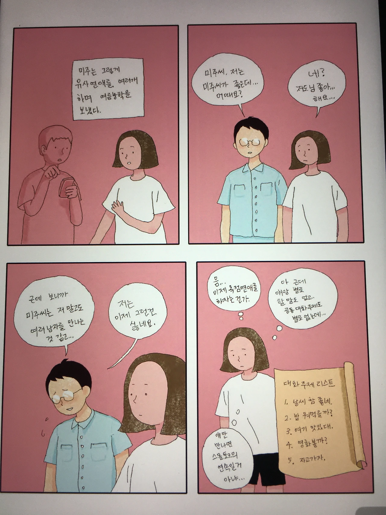 스몰토크... 나도 20대 초반엔 여자애들이랑 만나면 스몰토크의 연속이었던 것 같다. 대관절 그때 (여자애들이랑) 편하게 재밌게 대화할 수 있는 남자애는 어떤 아이들이었을까. 저 남자애의 멋쩍은 표정, 안쓰럽지만 뭐 알아서 잘해야겠지.