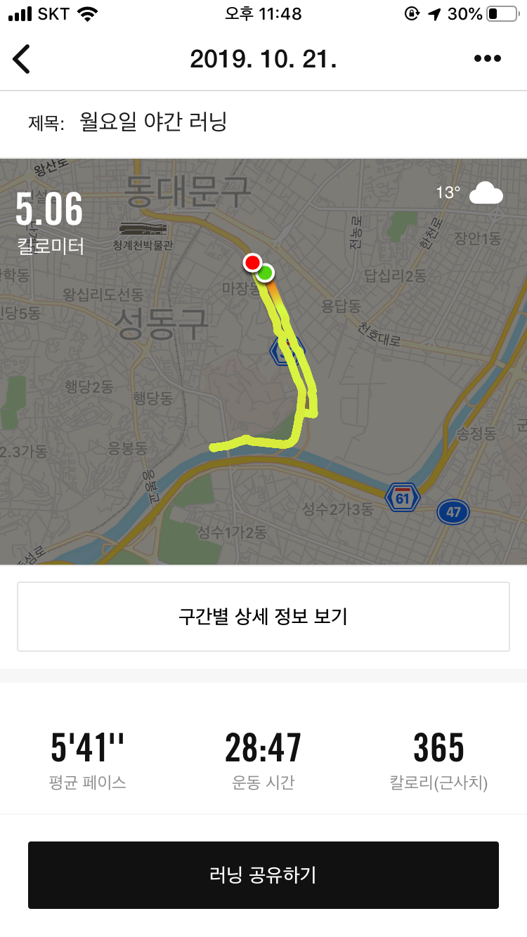 하천을 뛰면 사람이 없어 뛰기 편하지만 어둡고 사람이 별로 없다. 거의 혼자 달리는 셈이다.