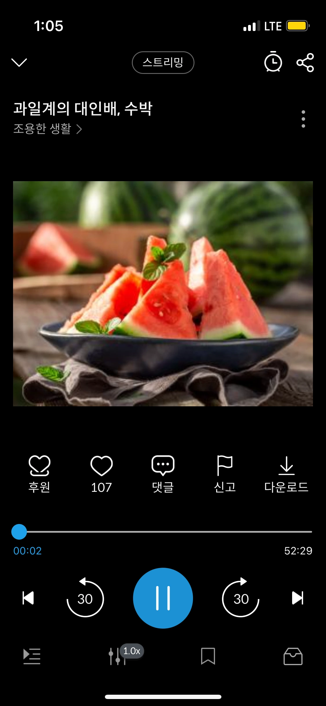 올해 들어 이어폰을 세 번이나 잃어버린 나는 선뜻 원래 쓰던 것을 다시 사지 못하게 되어, 임시방편으로 산 듣보 이어폰을 끼고 오랜만에 달리기를 했다. 금요일에는 이제 한풀 꺾였나, 아니면 매번 이 정도로 더웠는데 엄살을 부렸나 하는 생각이 들 정도로 덥지 않았다. 러닝을 할 때에는 무조건 팟캐스트를 듣는다. 일정한 박자로 뛰어야 한다는 압박감이 없는 나른한 말들이 오래 뛸 수 있는 힘을 주는 것 같다. 그 날의 팟캐스트에서는 계절 식재료를 주제로 두 패널이 수박에 대한 이야기를 나눴다. 수박...최근에 유향이가 수박을 왜 좋아하냐고 물어보기도 했었다.