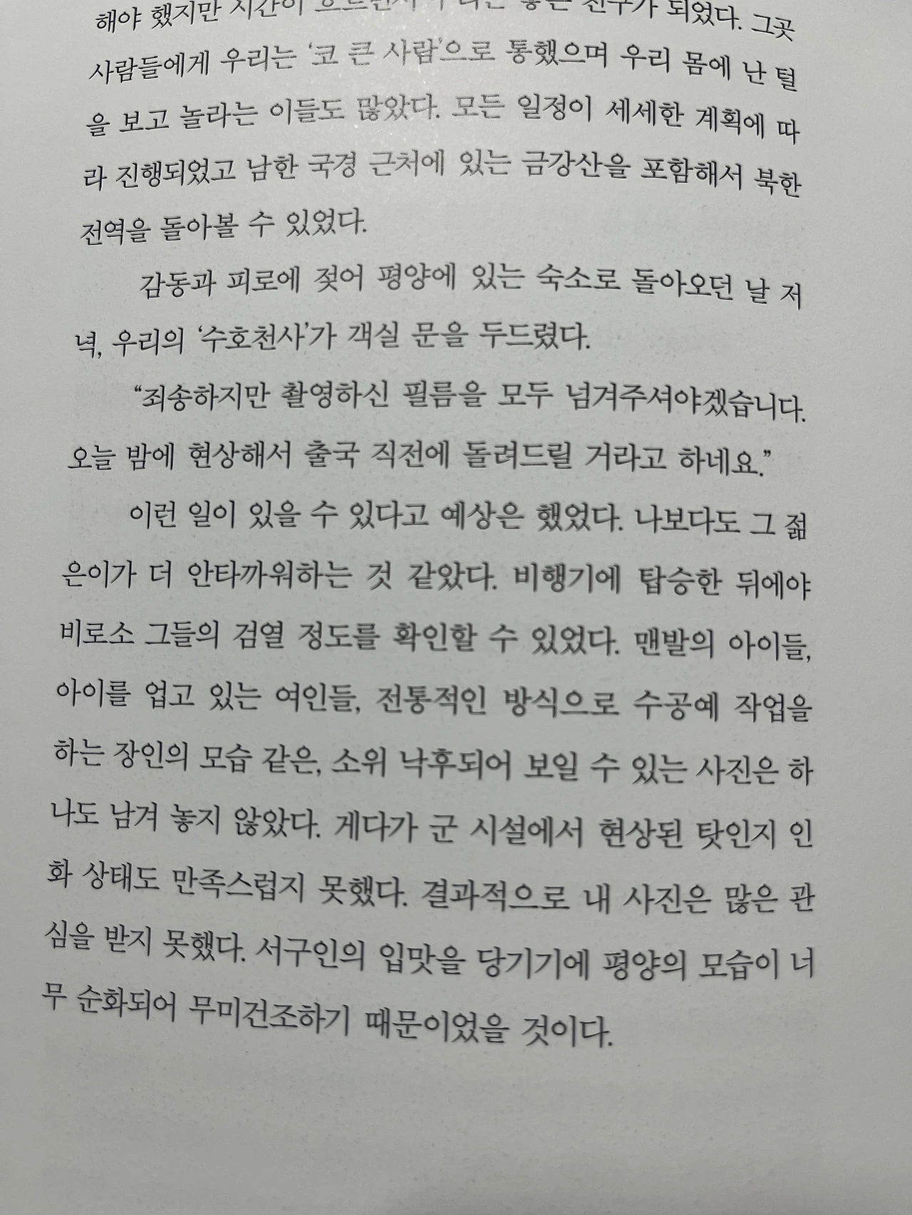 62년도에 두 사람이 평양에 간 이야기가 흥미롭다. 친절하고 영어를 잘 하는 보위부 사람들에게 필름을 털려 허망해하는 얘기가 웃김.