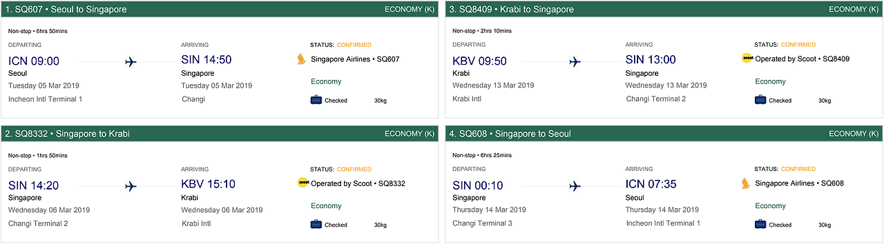 이번 여행은 싱가포르 항공 이벤트를 구경하다 비행기 표를 결제해버리면서 시작되었다. 어느 날 예전에 이용했던 싱가포르 항공의 마일리지가 아직도 남아있는지 궁금해서 항공사 홈페이지에 들어가 보았다. 6년 전의 일이라 마일리지도 없고 심지어 로그인 계정도 지워지고 없었지만, 어쩌다 보니 그곳에서 내 마음속의 여행지 목록 중 하나였던 태국 끄라비 행 표를 얻었다.