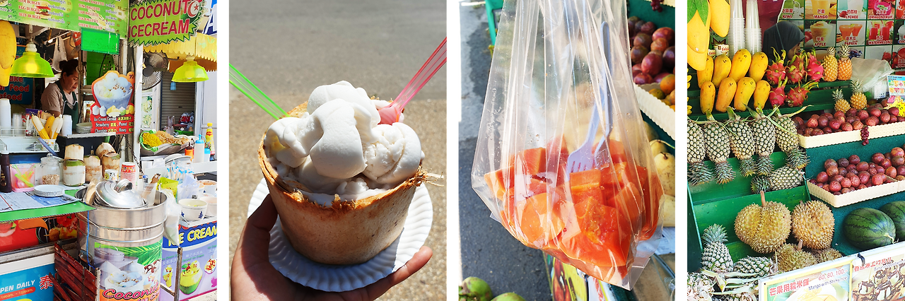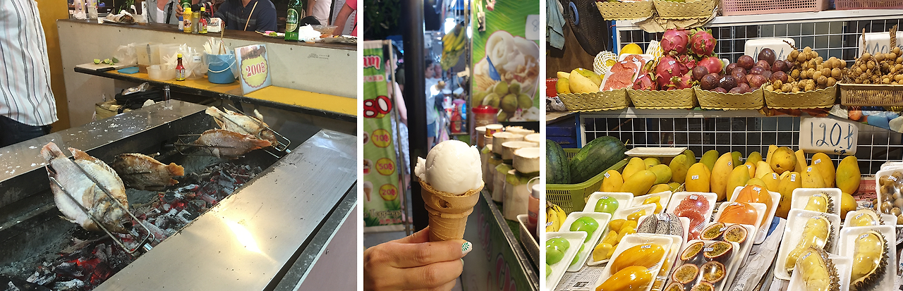 여유 있게 보내자는 원래 계획과는 다르게, 몸은 좀 피곤했지만 들뜬 기분에 더 구경하고 싶기도 해서 야시장을 가보기로 한다. 해변을 따라 쭉 걸어 도착한 야시장에는 태국 음식들과 쇼핑 거리들이 있었다. 길가에서 조리해서 파는 팟타이를 보고 또 먹고 싶었지만 배가 이미 불렀기 때문에 작은 코코넛 아이스크림을 먹었는데 이것도 꽤 맛있었다. 과일들은 대부분 먹기 편하게 손질하고 잘려 있어서 좋았다. 파인애플, 망고스틴, 롱간, 패션프루츠, 파파야, 포멜로(큰 자몽) 등 종류 별로 다양하게 많이도 사 왔다.