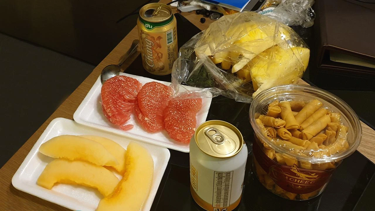숙소에서 잠들기 전, 오늘의 야식 메뉴는 야시장에서 산 과일인 파인애플, 포멜로, 하미멜론, 유나 님이 싱가포르에서 사 온 새우 과자, 편의점에서 산 태국 브랜드 싱하, 창 캔맥주이다. 파인애플을 자른 방식이 특이한데 먹기 좋은 방법인 것 같다. 닭다리처럼 한 손에 들고 뜯으니 정말 맛있다. 포멜로는 자몽과 비슷한데 더 크고 덜 시고 알갱이가 탄탄한데 맛있다. 파파야는 은은한 단 맛과 적당한 식감이 좋아서 이 또한 역시 맛있다.