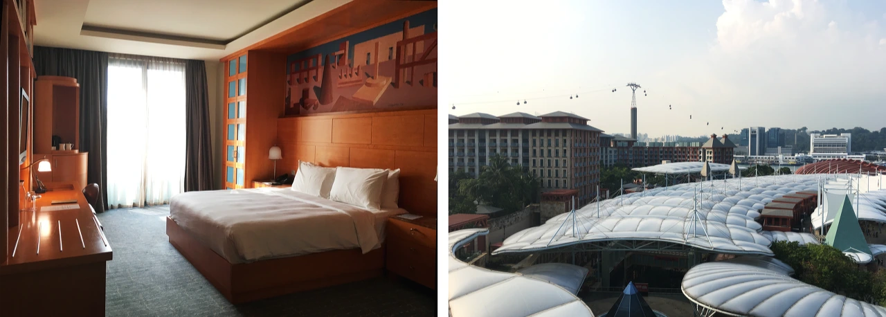센토사에서 머무를 숙소를 예전에 가서 좋았었던 '실로소 비치 리조트'로 예약했다가 리조트 월드 센토사 호텔 계열 '호텔 마이클'로 숙소를 바꿨다. 실로소 비치 리조트는 그때도 방 상태는 그저 그랬는데 시간이 지나서 더 안 좋을 것 같았다. 그리고 밤늦게까지 안전하게 다니고 카지노도 즐기고 싶었기 때문에 이 호텔로 선택한 것도 있었다. 숙소는 사진에서 본 그대로이고 높은 층으로 부탁했더니 케이블카도 보이고 경치까지 좋았다.