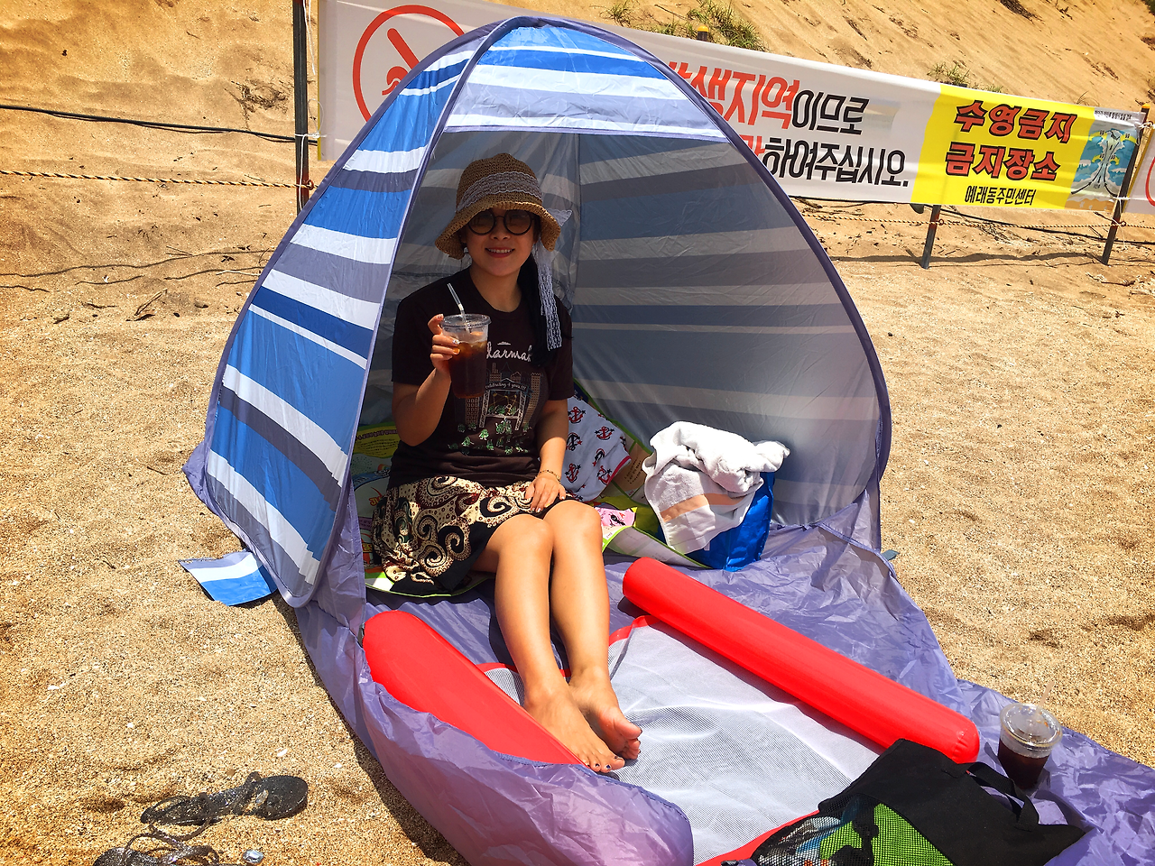 친구가 차에서 미니 텐트와 해먹 튜브 등을 꺼내왔다. 텐트는 팝업 형으로 딱 두명 들어가기에 적당했다. 관광지답게 좋은 자리는 파라솔 대여를 하고 있었고, 우리는 해변 구석에 텐트치는 구역에 자리를 잡았다.