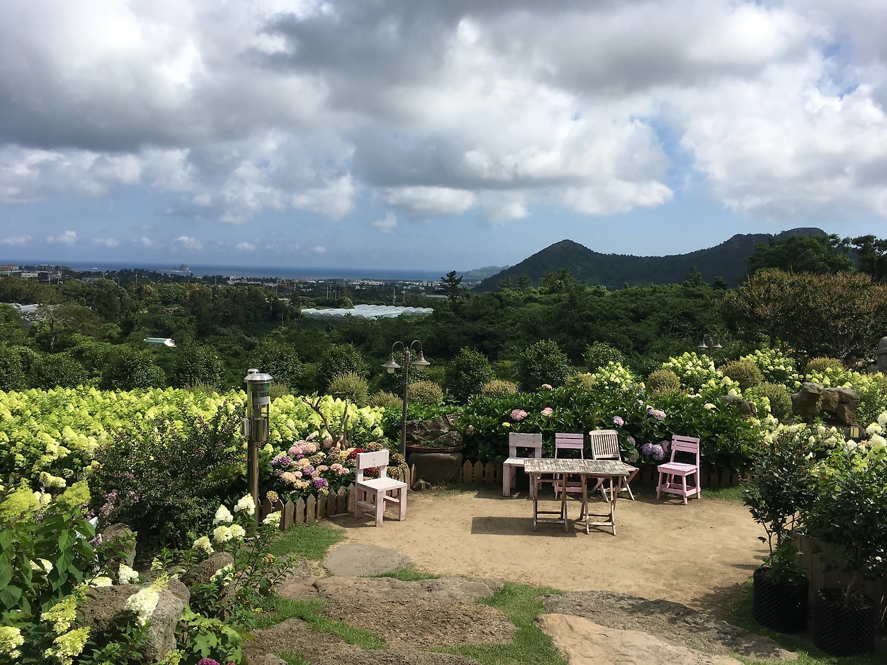 카페엔 에프터눈 티 찻잔과 티팟, 트레이들이 박물관 수준으로 많고 예쁘게 진열되어 있었다. 그런데 카페는 작은 일부분이고 더 큰 부분은, 관리가 잘 되어있는 대단한 정원이었다. 수국만이 아니고 핑크뮬리, 동백나무, 귤밭 등이 있어서 어느 계절에 와도 좋을 것 같다. 제주에 올 때마다 들려도 좋겠다. 친구 덕에 눈이 아주 호강을 했다.