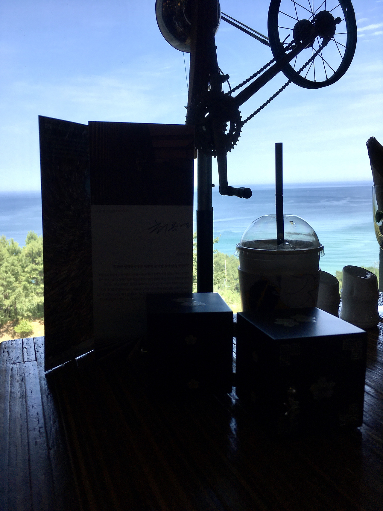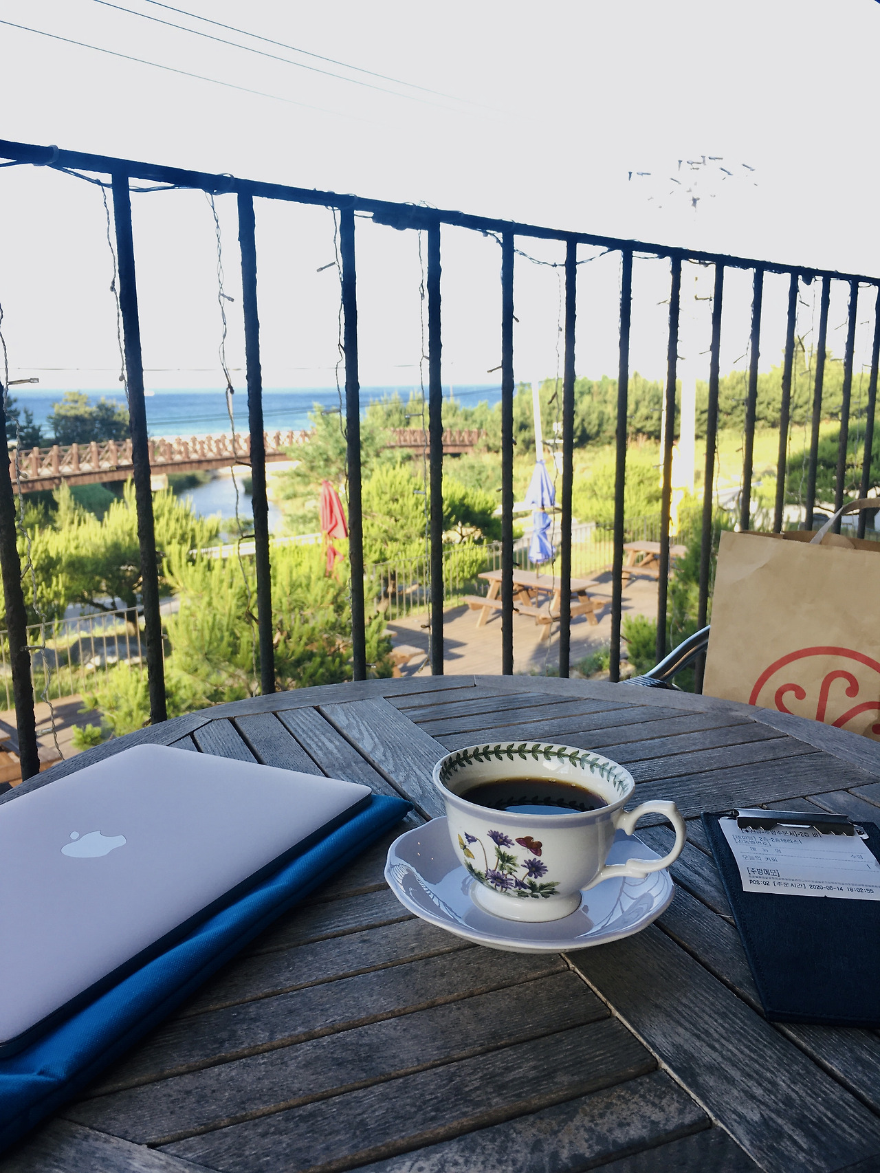 오늘의 커피인 '파나마 게이샤'를 주문하고 2층 바다가 보이는 야외 자리에 앉았다.