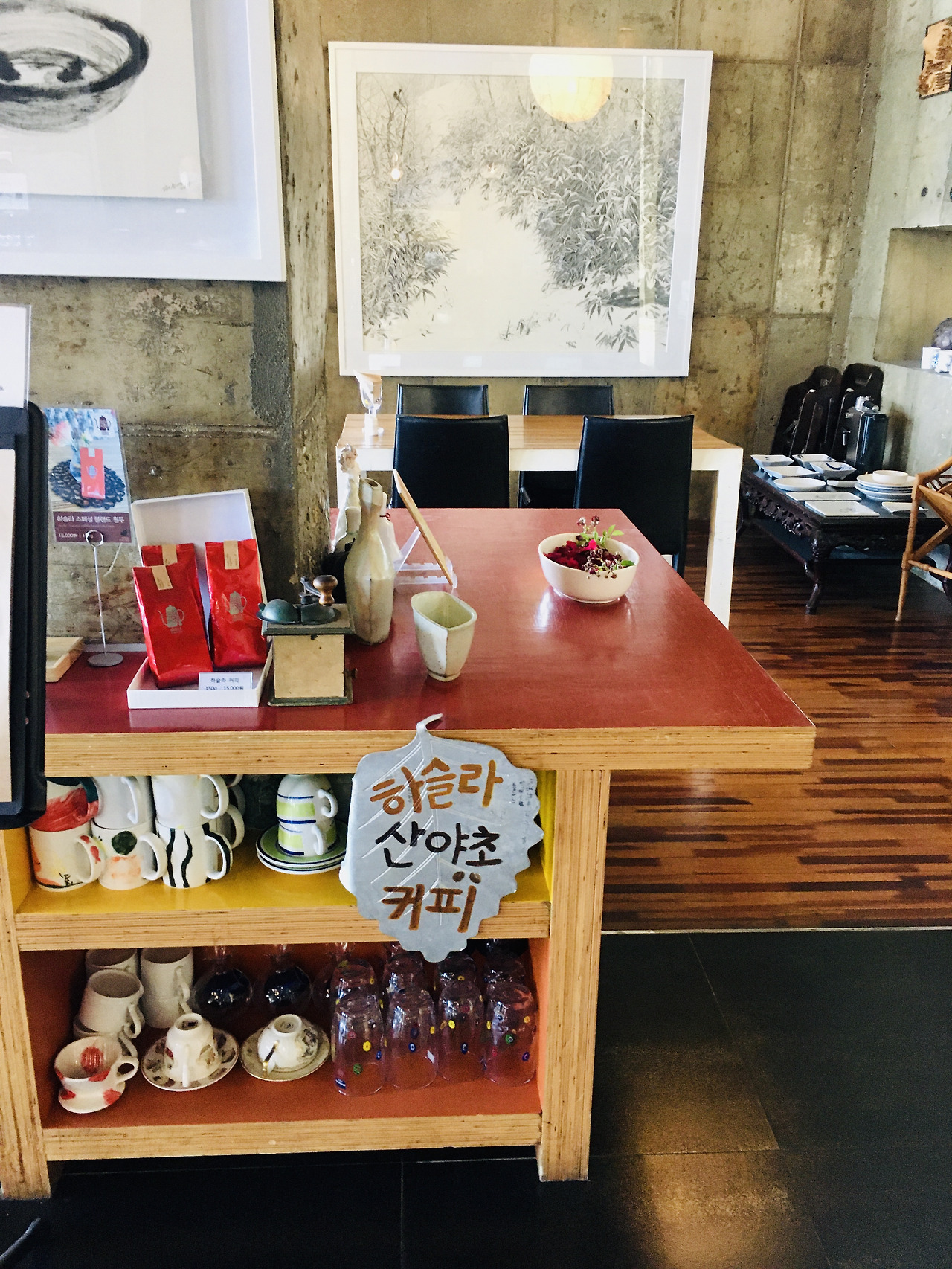 관람을 다 하고, 미술관과 연결된 레스토랑에서 커피를 마시기로 한다. 이곳에 있는 모든 커피의 원두는 산야초가 들어간 것이라고 한다. 내가 좋아하는 신맛이 나는 계열이라 맛있었다. 박이추 선생님 카페도 갈 예정인데 오늘은 고급 커피 잔치가 열리겠다.