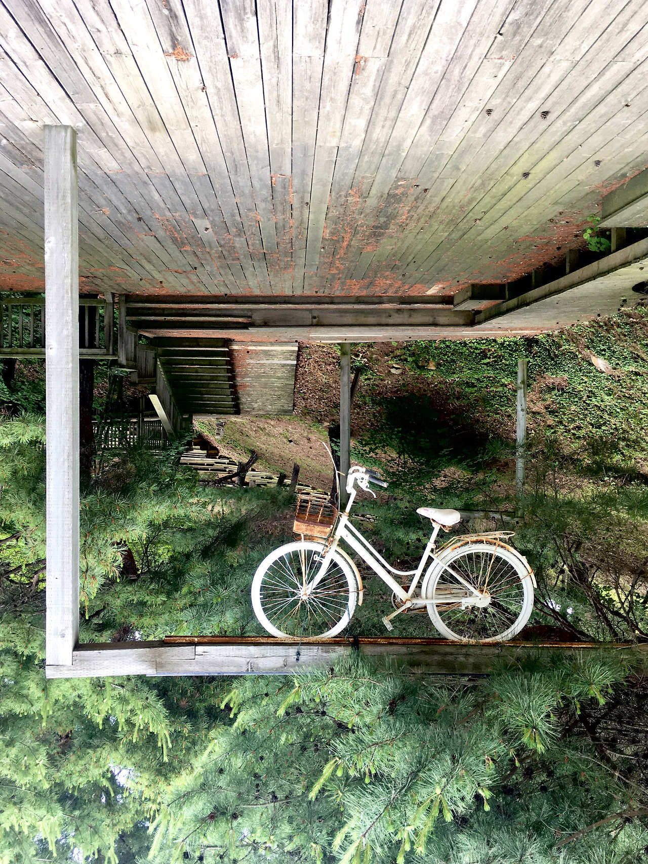 잘 정돈된 조용한 숲 속을 걸으니, 어찌할 바를 모르고 엉켜있던 내 마음도 조금 정리가 되어가는 것 같다. 요즘 자전거를 자주 타서 그런지 자전거 작품에 눈길이 간다. 위에 매달려 있는 자전거를 찍어서 사진을 뒤집어 보았다.