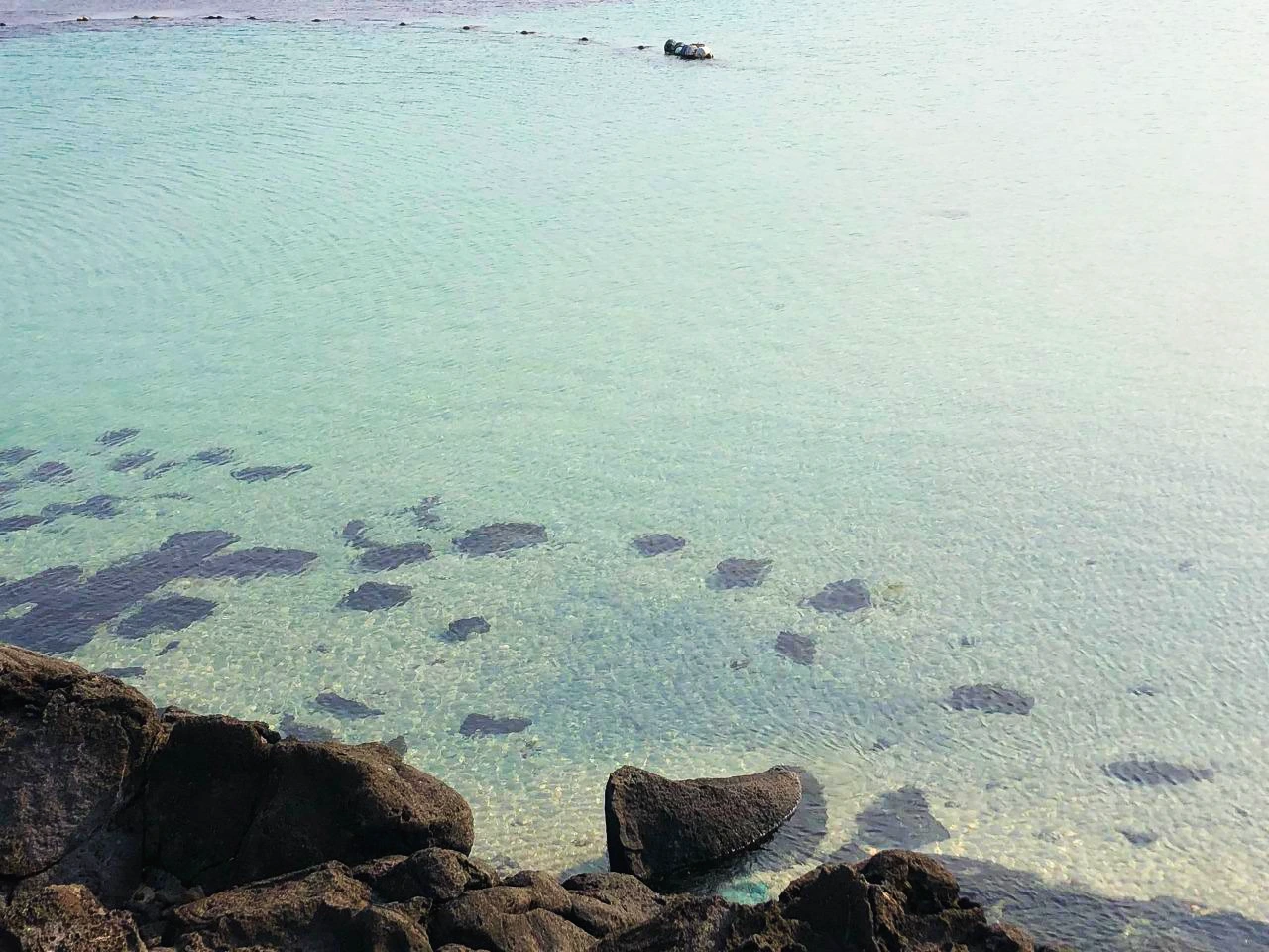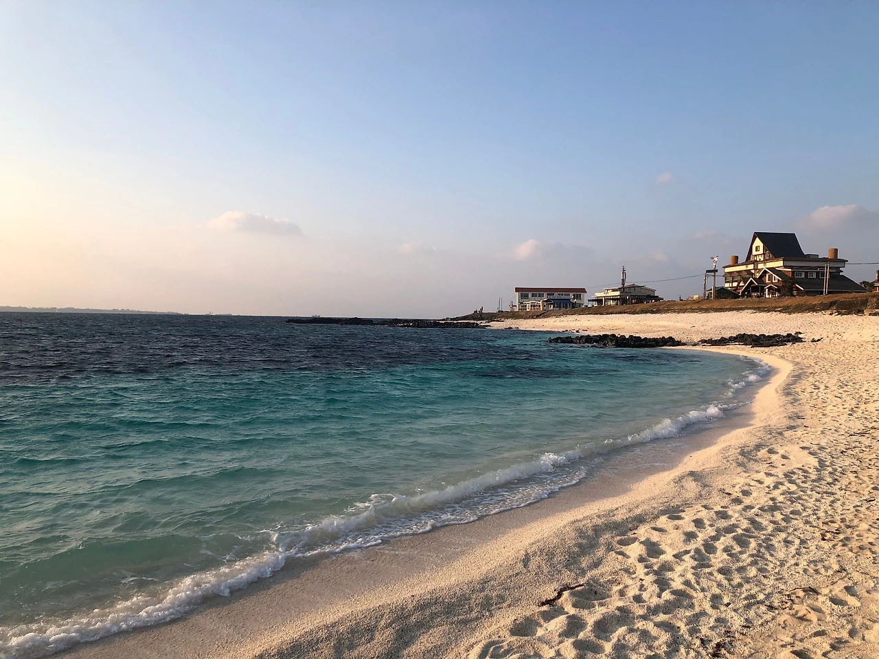 숙소로부터 걸어서, 모래가 아닌 산호로 이루어진 '서빈백사' 해변에 왔다. 하얀 산호와 검은 현무암이 바닥을 이루니 물빛이 더욱 푸르고 대조되어 아름답다.