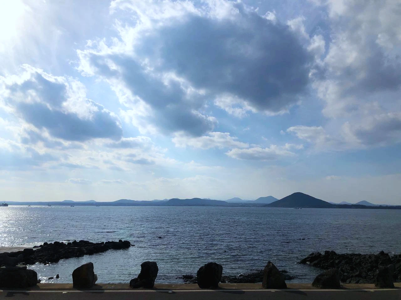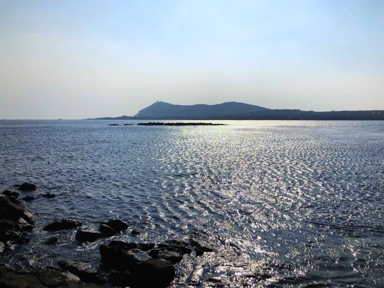 우도의 검은 모래 해변에 왔다. 버스정류장 이름을 보니, 이 지역에서는 검몰래라고도 하는 것 같다. 호를 이루어 바다와 언덕의 사이좋은 모습이 따뜻하고 멋있어 보인다.