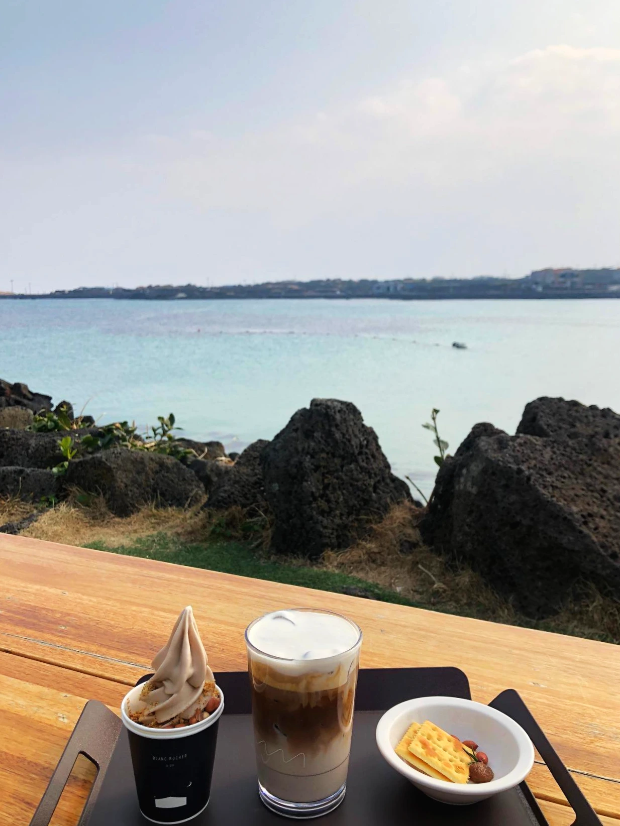 하고수동 해변: '블랑로쉐'에서 해변을 바라보며 '우도 땅콩라떼' 마시기