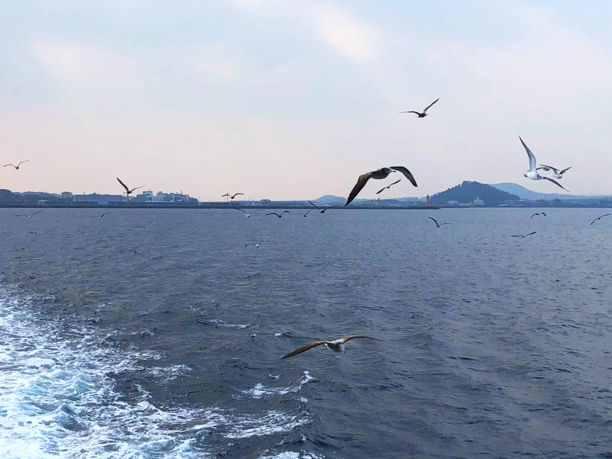 임시 우리 동네인 세화를 뒤로 하고, 성산포항에서 출발하여 우도의 하우목동항으로 가는 배를 탔다. 차 안에 있는 상태로 운전을 하여 배를 타게 되었는데, 차에서 나와보니 뒤편으로 갈매기로 보이는 새들이 배를 계속 따라오고 있었다. 위쪽 선실에서 손님들이 과자를 주는 것 같았다. 덕분에 한층 아래에서 새들의 가지런히 모은 두발과 시원한 날갯짓을 좀처럼 보기 어려운 방향에서, 자세히 볼 수 있었다.