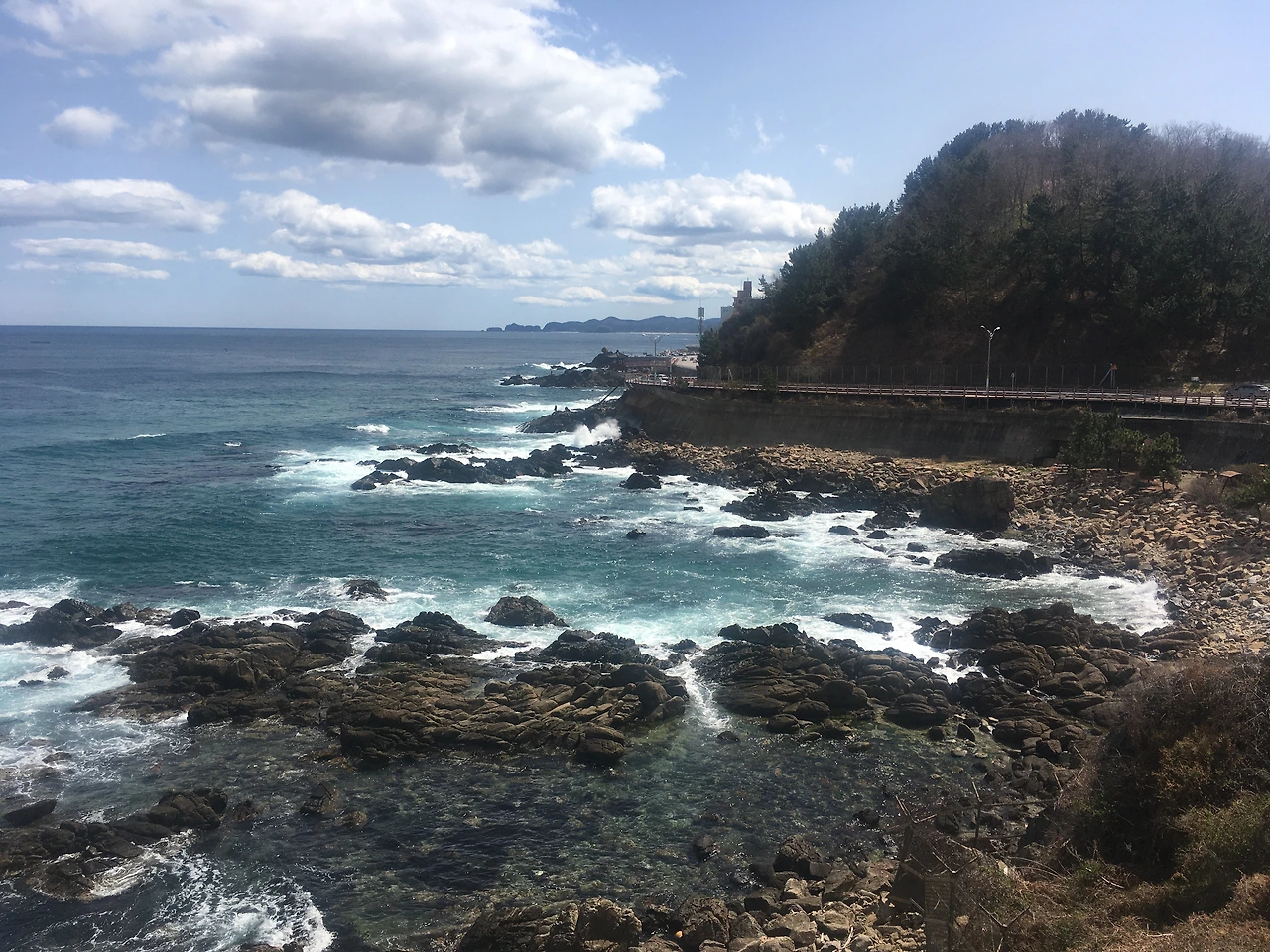7번 국도보다 더 안쪽의 최대한 바다에 가까운 도로, 어떤 때는 이면 도로로, 고성에서 해안 길을 따라 동해까지 왔다. 제주도에는 아름다운 장소를 경유하는 느린 길을 안내하는 경로가 내비게이션에 추가되었다고 하는데, 동해 해안 등 전국에도 곧 생기지 않을까 기대를 해본다. IT업에 종사하는 사람으로서, 나도 이런 프로젝트에 참여하면 재미있겠다 하는 생각도 들고.