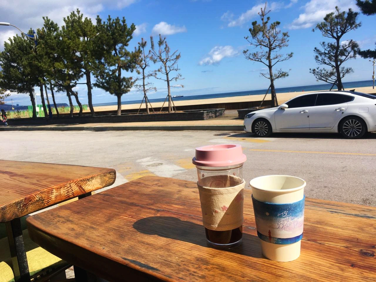 카페에 앉아 오늘 갈 길을 가만히 생각해본다. 드립 커피를 주문했는데 사장님께서 감사하게도 커피가 연하게 내려진 것 같다며 한잔을 더 내려주셨다. 챙겨 온 텀블러의 분홍 벚꽃이 지금 시절에 잘 어울린다. 바다를 따라 줄지어 서있는 소나무가 멋지다.