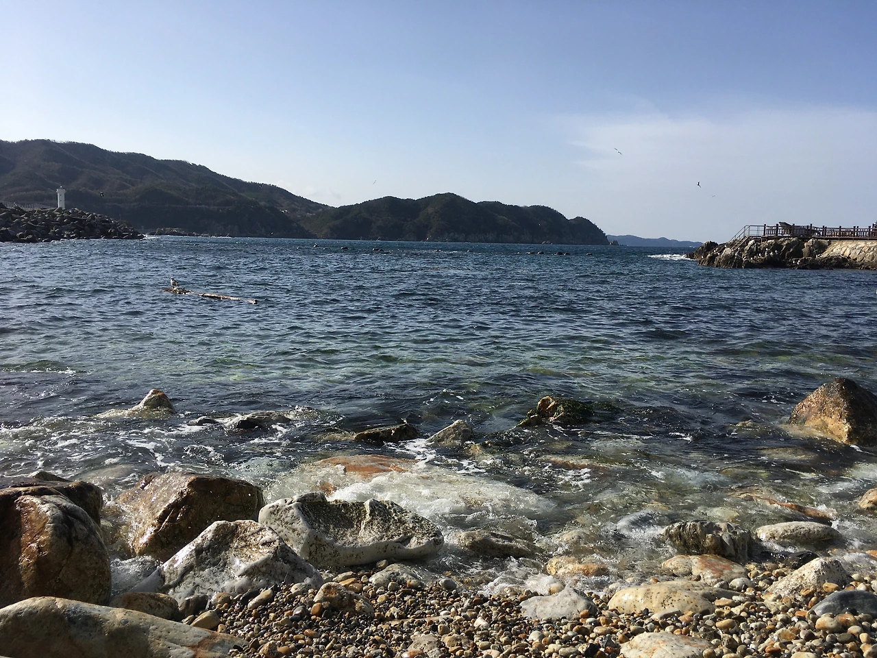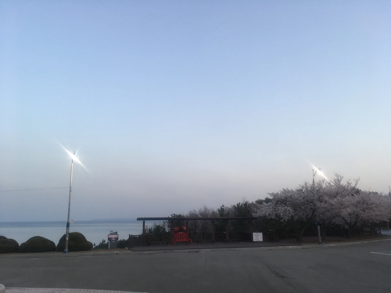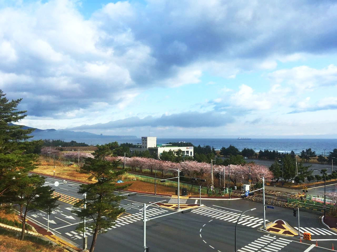 (다음날) 일부러 바닷가로 정한 숙소에서 밖을 내다보니, 비 오고 흐린 날은 지나가고 오늘은 햇빛이 쨍하고 공기도 깨끗해진 기분이다. 벚꽃을 보러 오기에는 조금 이른 애매한 시기이지만, 비가 적당히 온 다음이어서 그런 지 어제 봤던 것보다 꽃이 더 피어있는 것 같다.