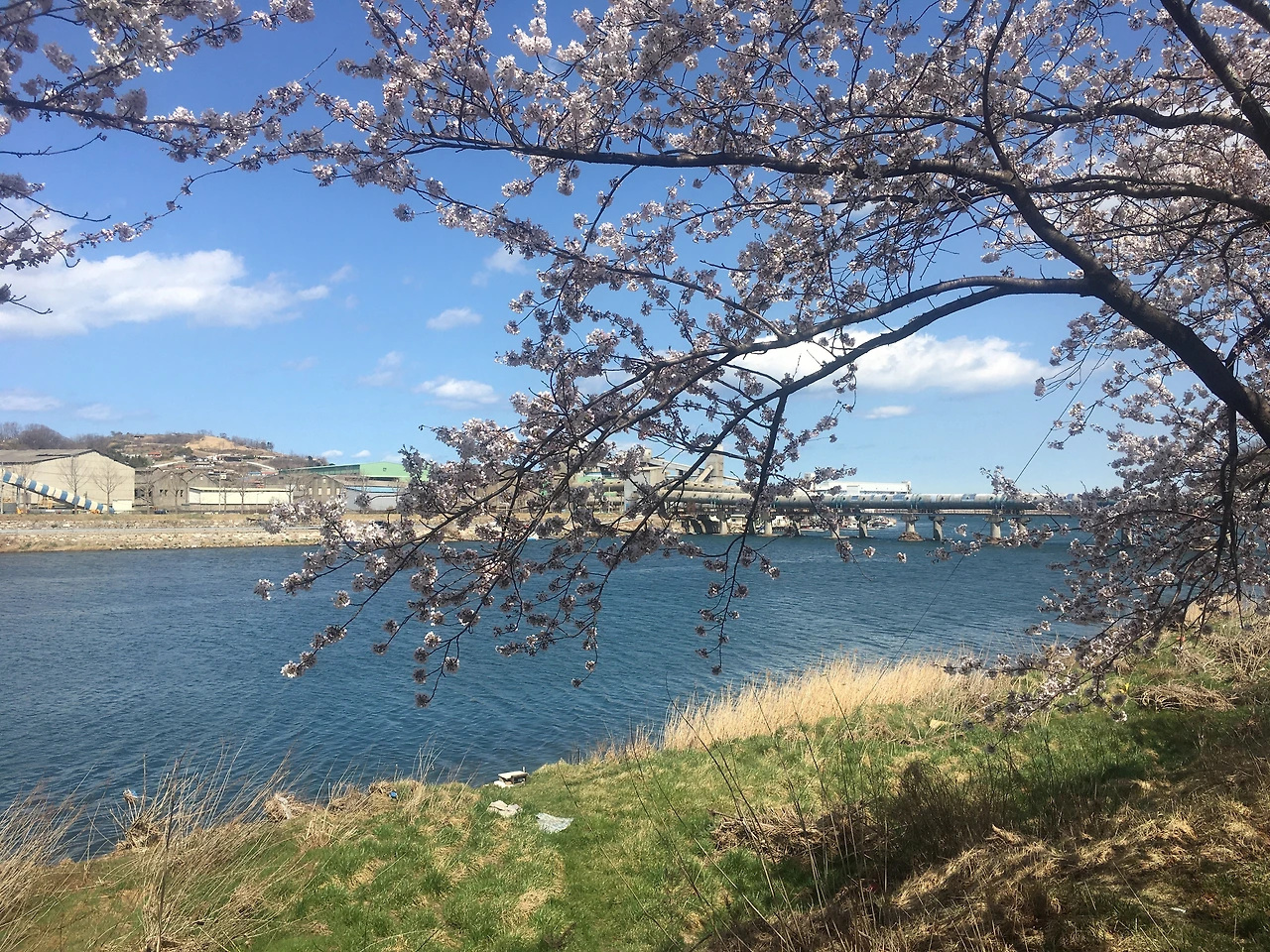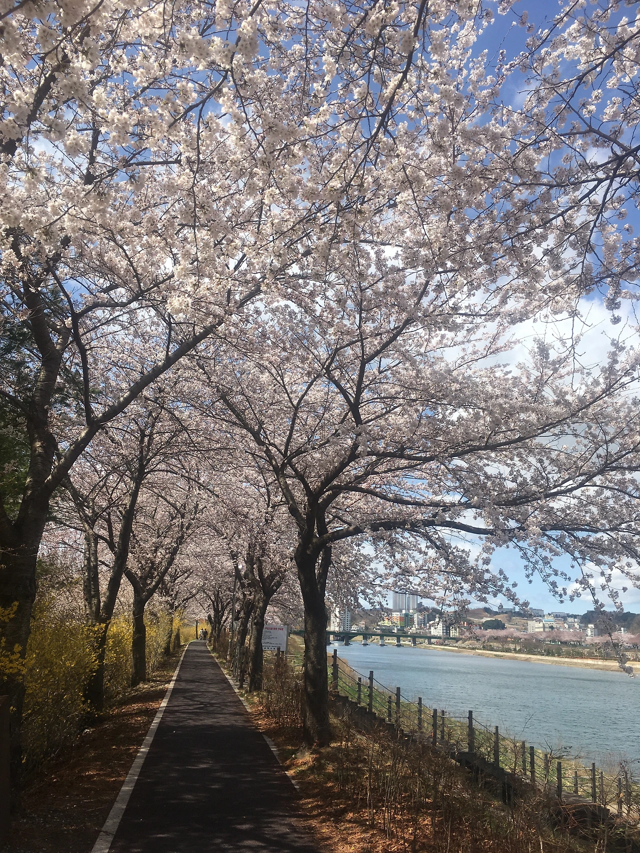 아직 겨울이라는 듯 깊은 차가움이 느껴지는 바다를 지나고, 사실은 정말 봄이 되었다며 벚꽃이 만개한 강변이 나타났다. 벚꽃을 보면 봄의 계절이라는 것은 부정할 수 없어진다. 인적이 드문 벚꽃길을 따라 걸어본다.