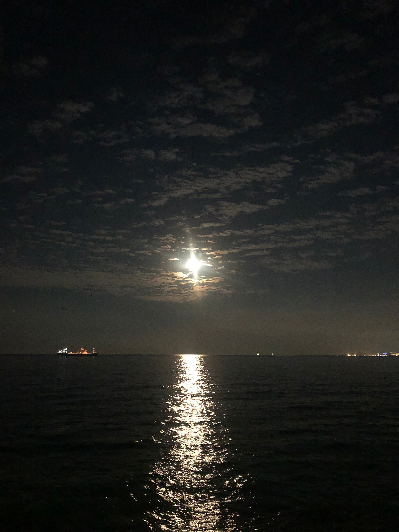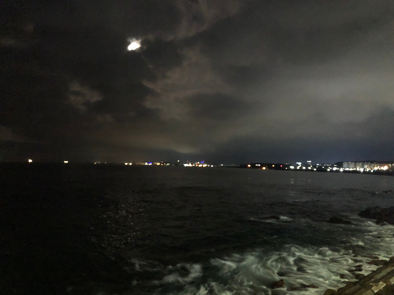 아름다운 일몰의 시간이 지나고 밤이 찾아온다. 유난히 어둡고 무서운 바다의 파도를 가만히 바라보다, 달과 저 멀리 배에서 조명을 밝히는 수평선 위를 바라보며 안도감을 느낀다.