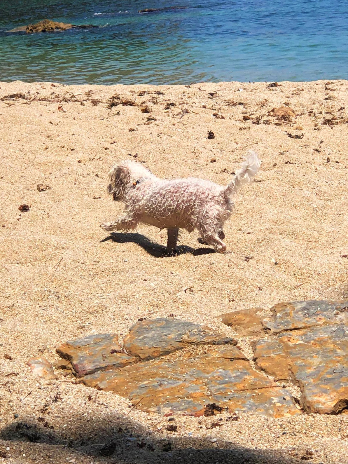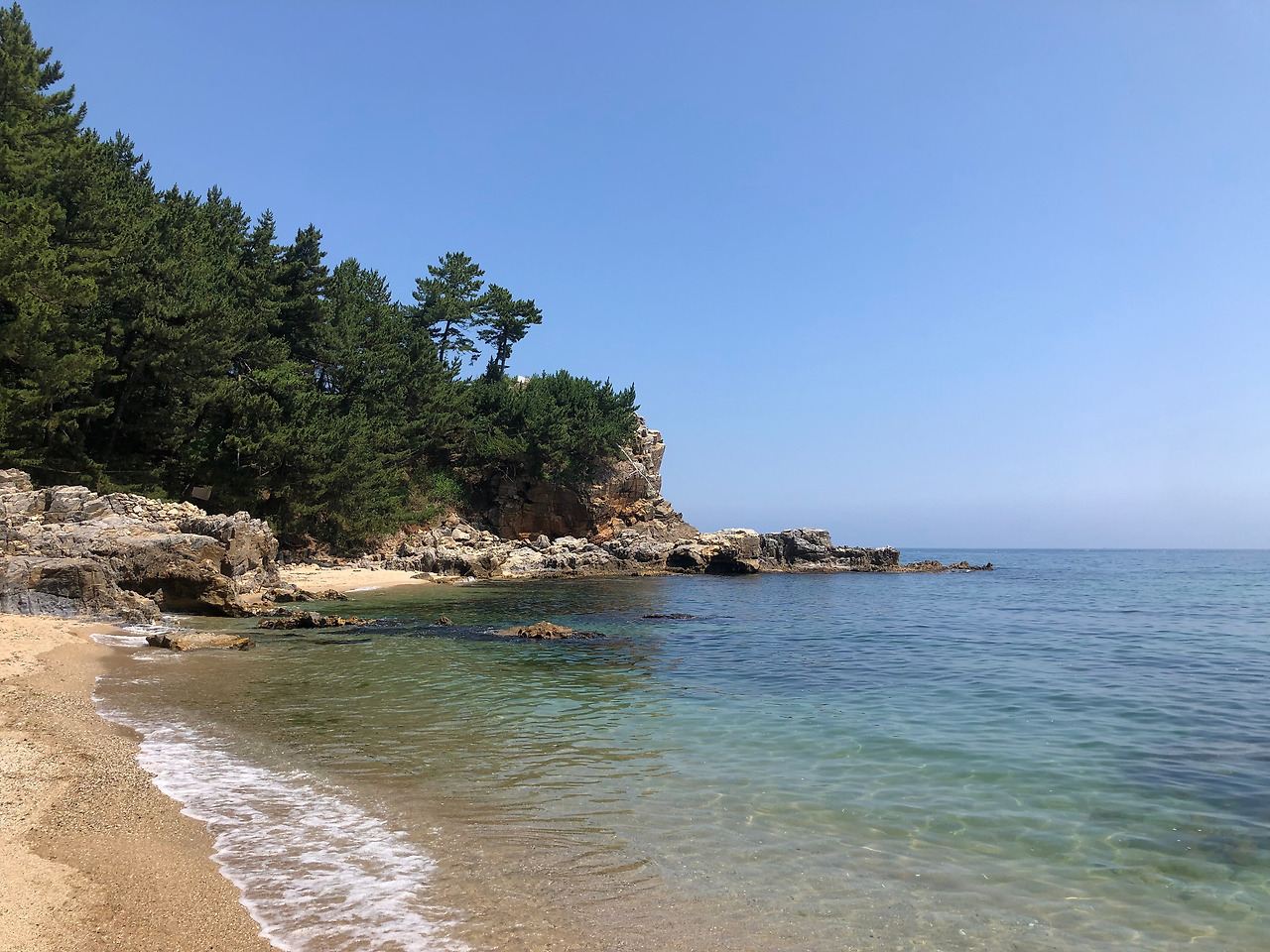 주차를 하고 짐을 들고 육교를 오르고 군사 지역 경고 문구를 지나 좁은 철문으로 들어가는 조금 으스스하고 어려운 길이었다. 하지만, 기대했던 조용하고 맑은 해변이 나와서 안도하였고, 절벽 아래 그늘진 곳이 있어 자리를 잡았다.
