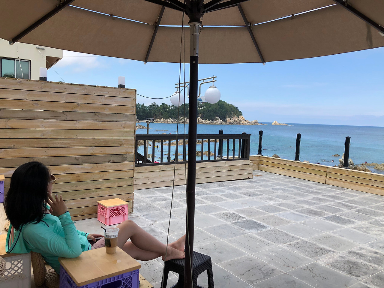 돌아가는 길에 스노클링 장소 쪽의 카페 옥상에서 잠시 쉬었다. 계획과는 조금 다른 여행이지만, 물놀이를 하고 카페에서 시원한 커피를 마시며 앉아서 바다를 바라보니 뭐가 어찌 되었든 다 좋았다. 뭘 해도 모두 즐겁다.