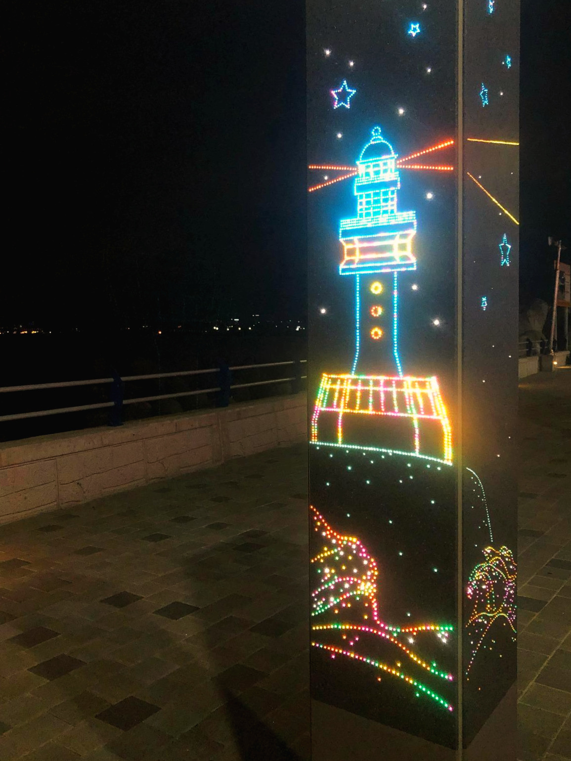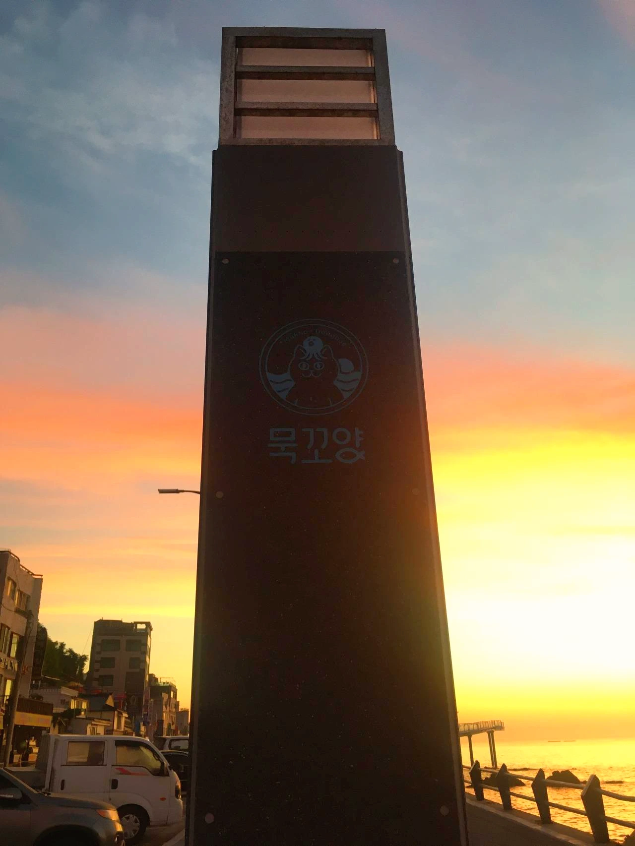 조용한 항구 마을도 걷고 관광지 분위기의 해변 구역도 걸어 본다. 낮에는 몰랐는데 해안길에 등대 모양으로 예쁜 조명들이 길을 밝히고 있다. 그리고 묵호항에는 캐릭터 묵꼬양이 살고 있다.