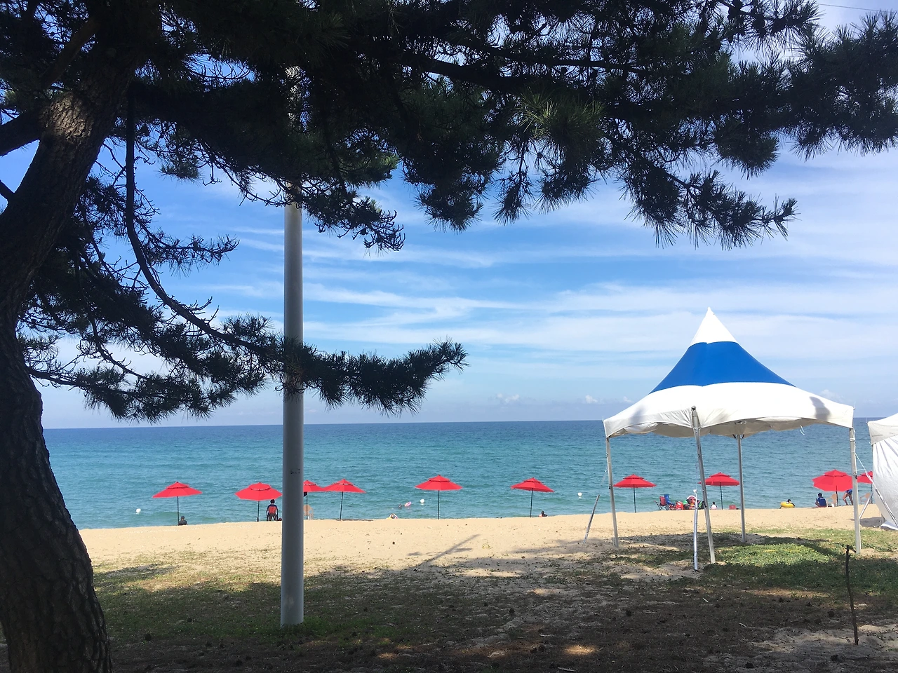나는 이제 이곳에 세 번째 방문인데 오늘도 첫날 우연히 만났던 거북이들은 없었다. 해수욕장 개장을 한 한참 여름인 중에 와서 보니 우리가 알던 고요한 모습이 아니고, 파라솔도 놓여 있고 사람들도 꽤 있었다. 잠시 노래를 들으며 쉬면서 발랄해진 분위기를 즐겨보았다. 한껏 푸른 바다를 보니 기분이 좋다.