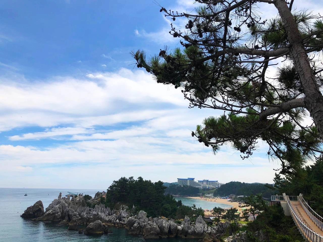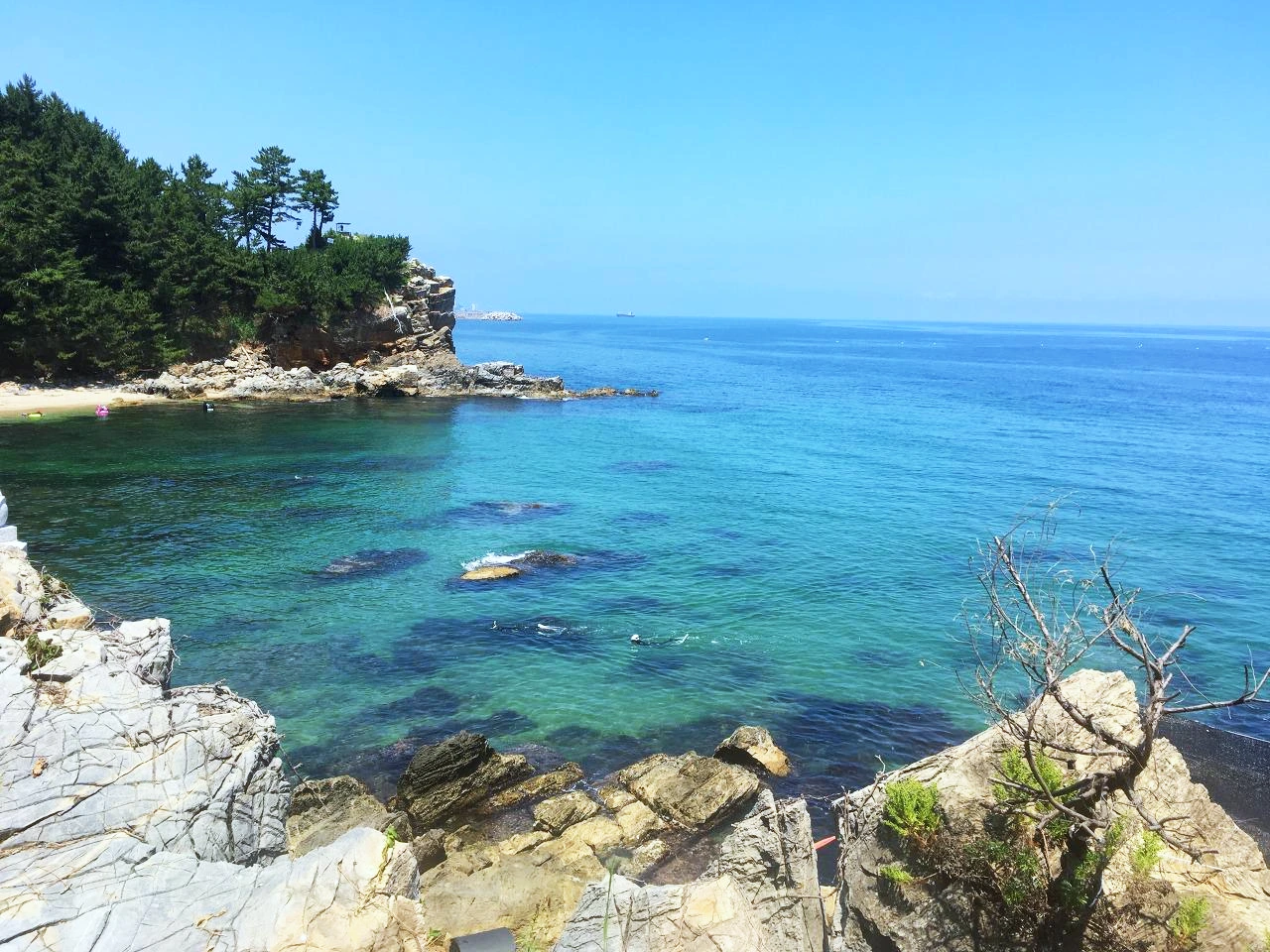 우리는 구석에 자리를 두고 물놀이를 하고, 관광객처럼 편의점에서 맥주도 사서 마셔보고 산책도 했다. 해수욕장 옆에 출렁다리가 있는 해안산책로 쪽으로 따라 가면 지대가 꽤 높은 곳에서 바다와 촛대바위를 볼 수 있다. 가는 길에 물빛에 정말 예뻐서 스노클링을 하러 갈 길이 있나 한참을 두리번거렸다.