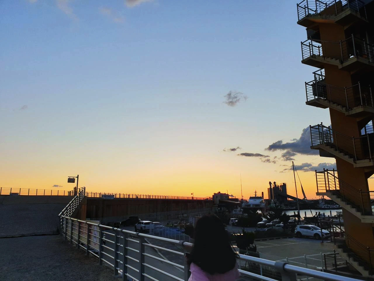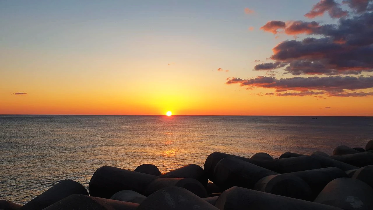 자다가 아침에 눈을 떴는데 해가 뜨려 하고 있었다. 별생각 없이 누워서 보고 있다가 아무래도 날씨가 좋아 잘 보이는 곳에 나가서 보는 편이 좋을 것 같아서, 뒤늦게 서둘러서 유나 님과 숙소 앞의 등대 쪽으로 달려 나갔다. 겨우 해가 뜨기 바로 전에 도착할 수 있었다. 수평선으로 뚜렷하게 떠오르는 해님을 반갑게 맞이하였다.