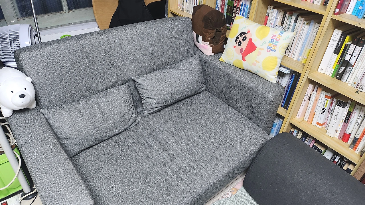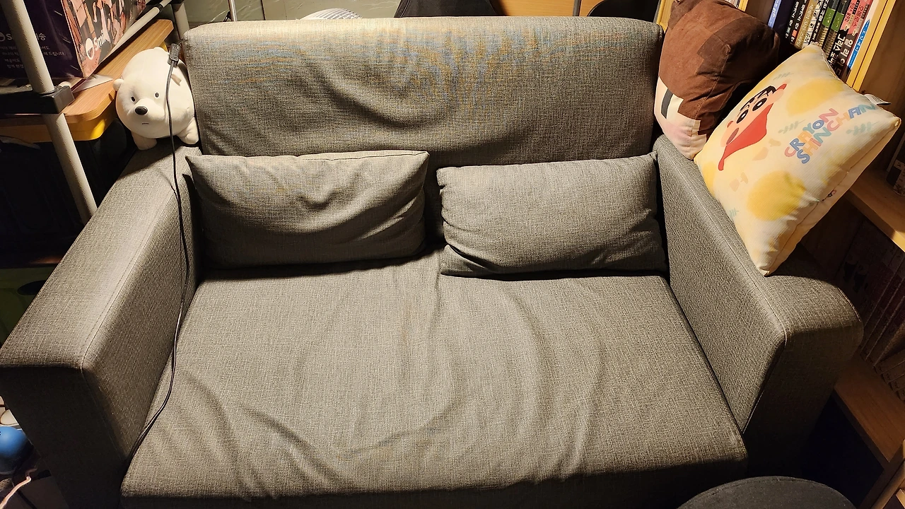 당근마켓에서 만원에 입양해 온 소파베드. 등받이와 앉는 부분이 쫙 펴지는 소파베드이긴 하지만 그 위에서 자기엔 쿠션마다의 차이로 인해 불가능하다. 아이들이 저 위에서 놀 때 그렇게 쓰기는 하지만. 보통은 안락의자로 쓴다.