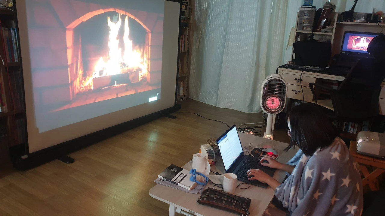 눈이 펑펑 오는 산속의 외딴 산장. 문을 열면 벽난로가 있고, 마룻바닥에 편백나무로 된 벽과 높은 천장. 엔틱 느낌 좌르르 흐르는. 짙은 회색의 러그가 깔려있는 마룻바닥은 벽난로의 열기가 닿는 부분은 뜨겁고, 열기가 닿지 않는 부분은 차가웠으면 좋겠어.