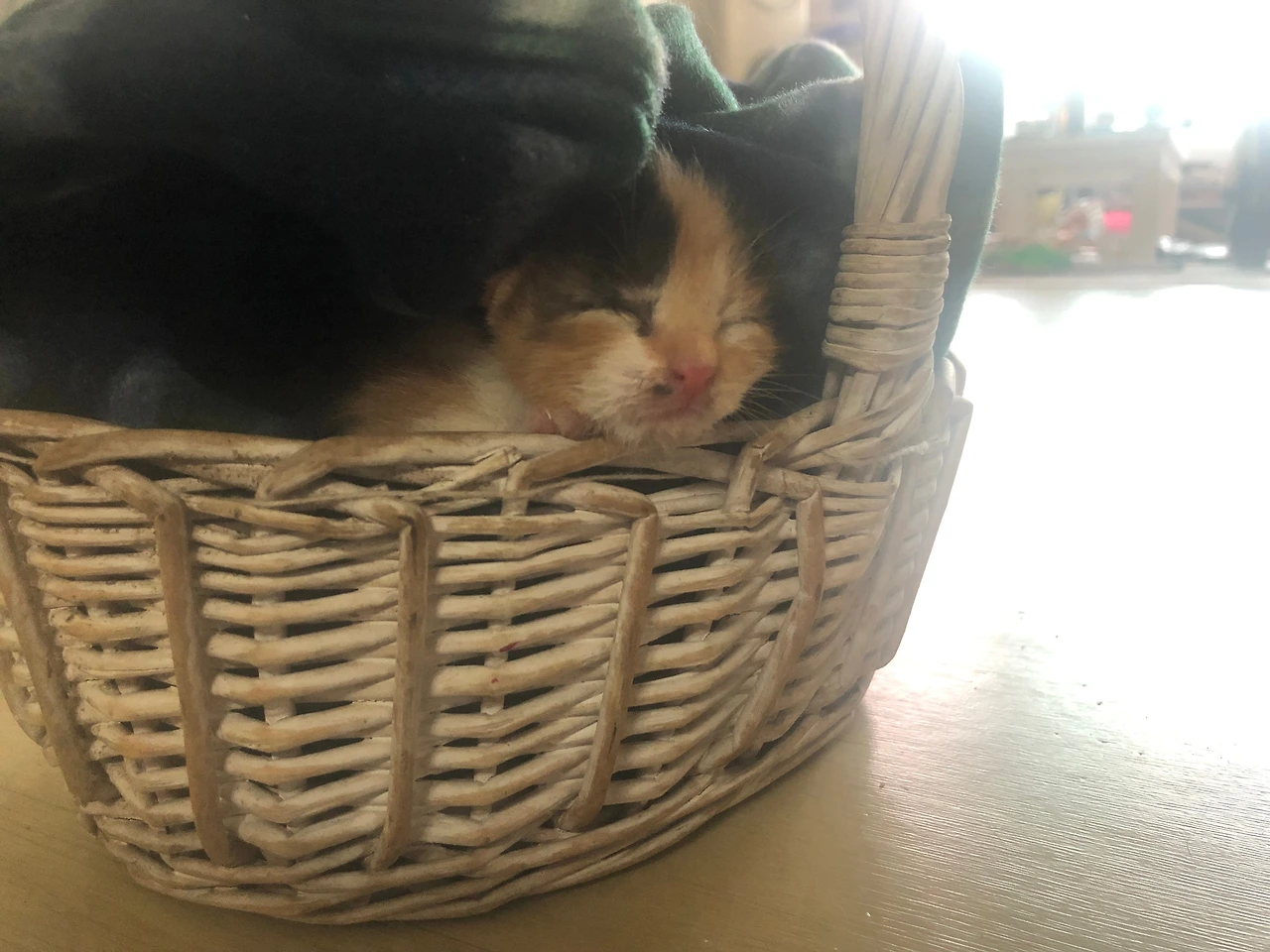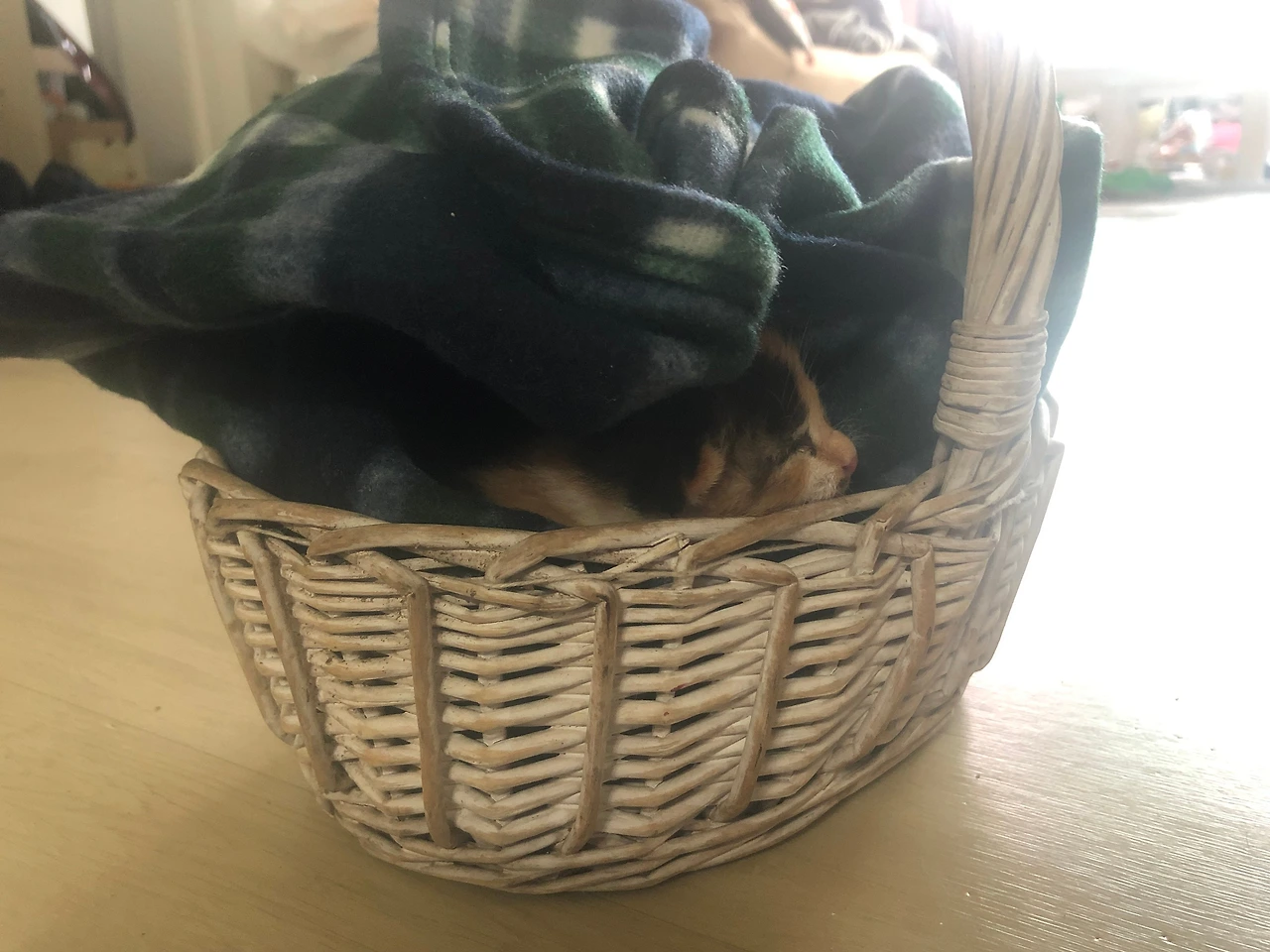 작은 바구니에 넣어, 어서 아기 고양이를 우리 집으로 데리고 왔어요.