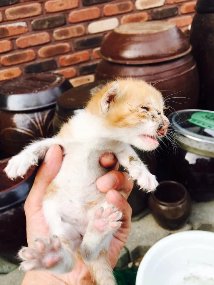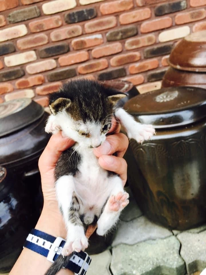 아주 깨끗하지는 않았지만, 그래도 어미가 잘 돌본 듯 하였습니다. 울기도 잘 울었구요. 쭙쭙이가 먹던 젖병으로, 어서 우유부터 먹이고 따뜻한 물을 적신 천으로 얼굴을 닦아 주었습니다. 눈은 인공눈물을 사용하여 닦아 주었습니다.