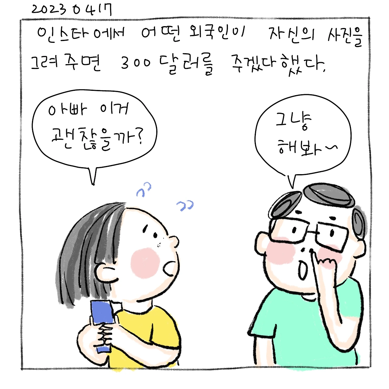 인스타에서 어떤 외국인이 자신의 사진을 그려 주면 300달러를 주겠다 했어요.