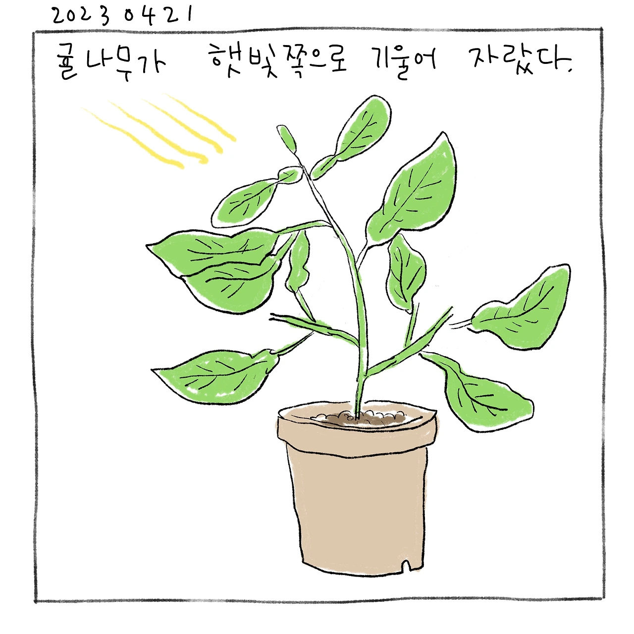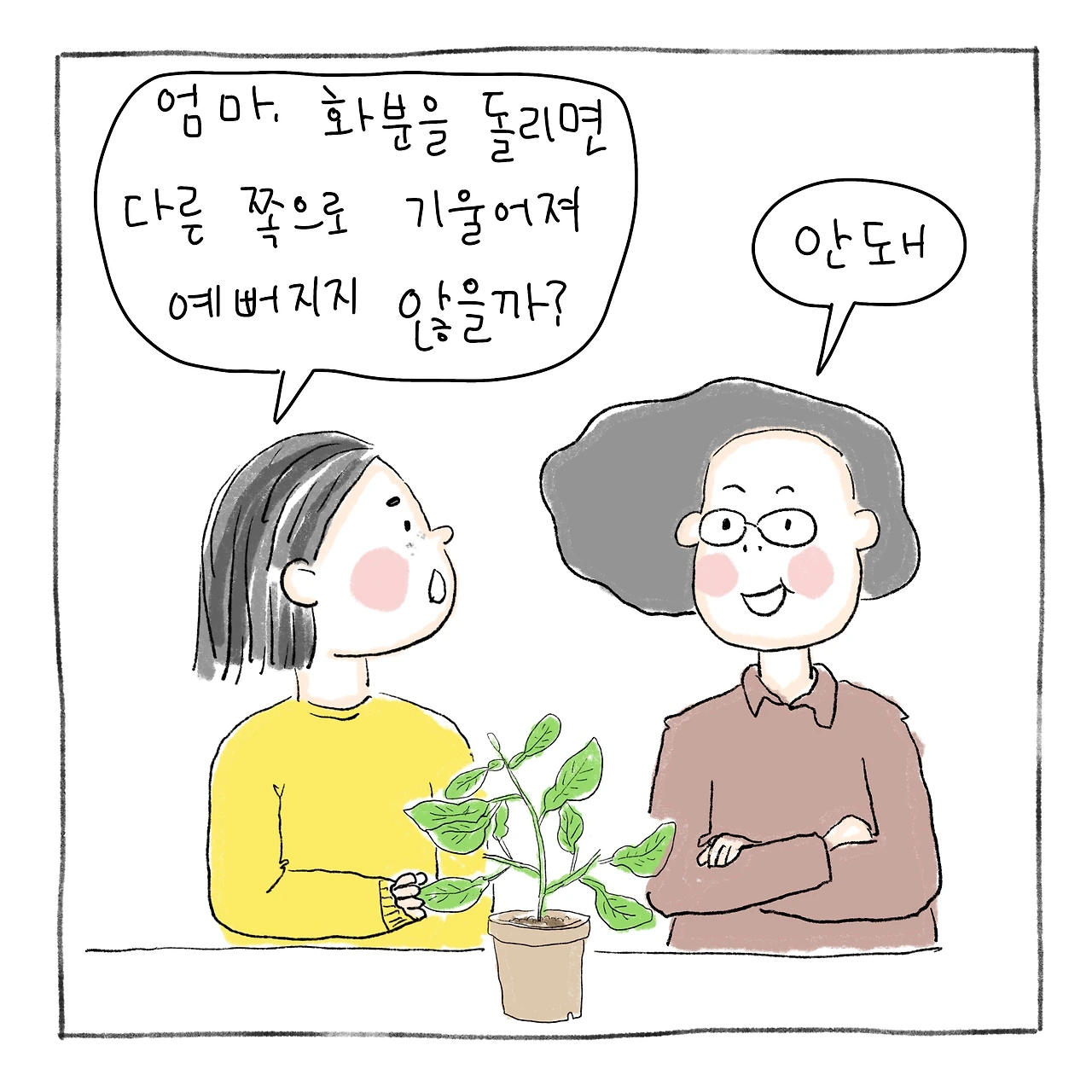 귤나무가 햇빛 쪽으로 기울어“ 엄마, 화분을 돌리면 다른 쪽으로 기울어져 예뻐지지 않을까?"