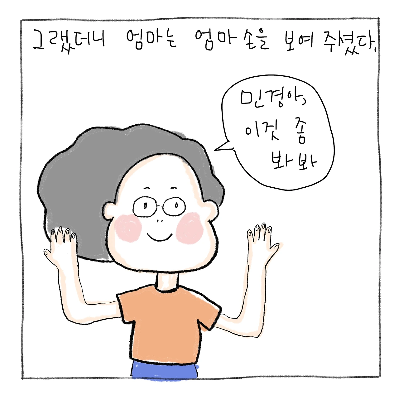 그랬더니 엄마는 엄마손을 보여주셨다. “민경아, 이것 좀 봐봐.”