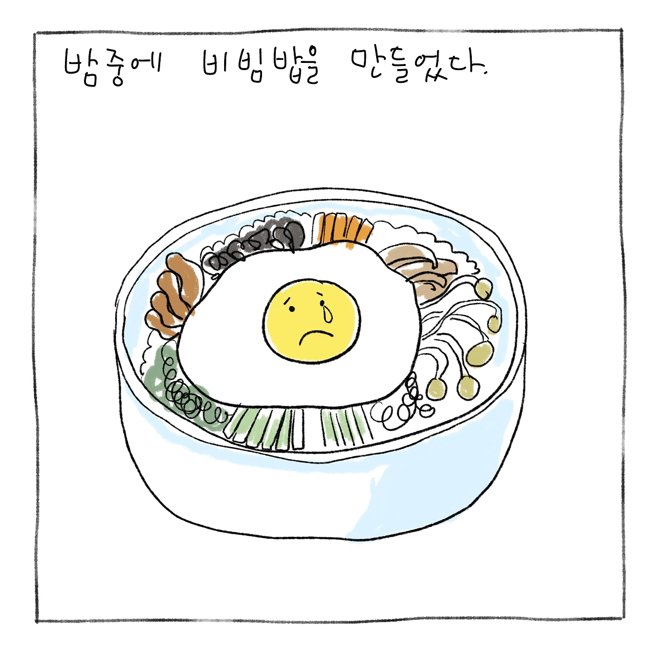 스트레스를 받았다. 밤중에 비빔밥을 만들었다. 한 그릇을 순식간에 먹었다. 그래도 스트레스가 가시질 않았다.