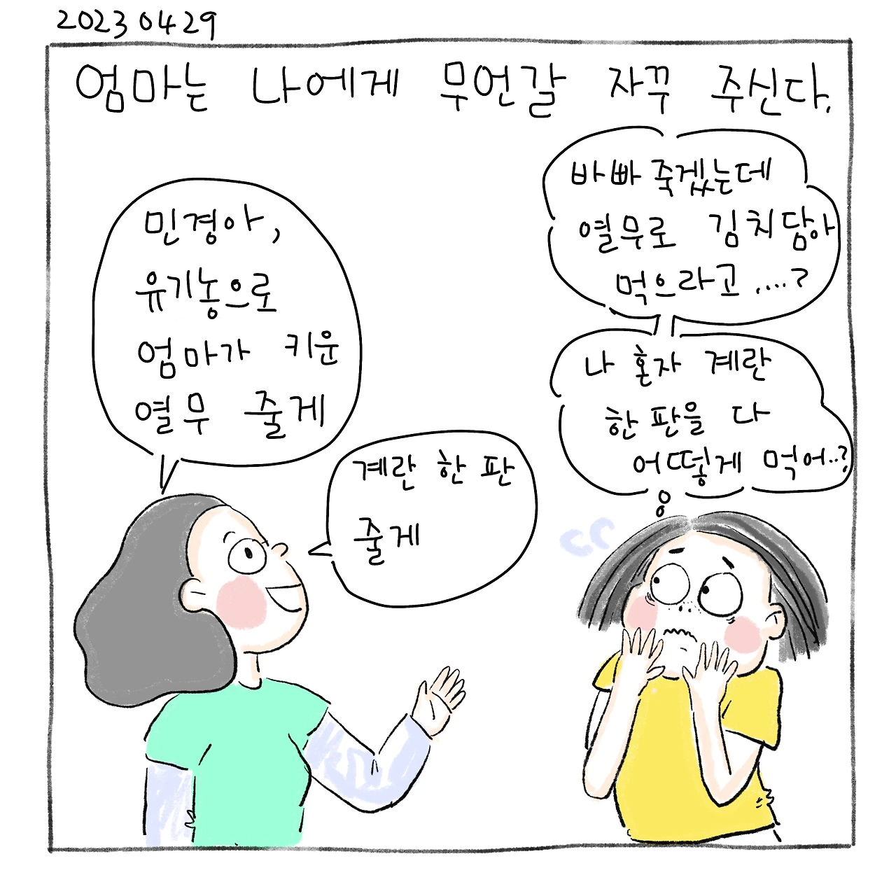 “민경아, 유기농으로 엄마가 키운 열무 줄게. 계란 한 판 줄게. ”