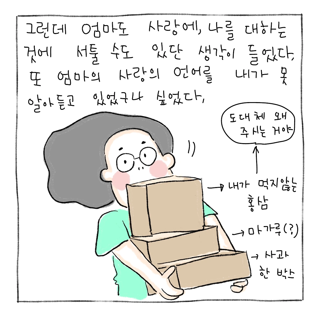 그런데 엄마도 사랑에, 나를 대하는 것에 서툴 수도 있단 생각이 들었다. 또 엄마의 사랑의 언어를 내가 목 알아듣고 있었구나 싶었다.