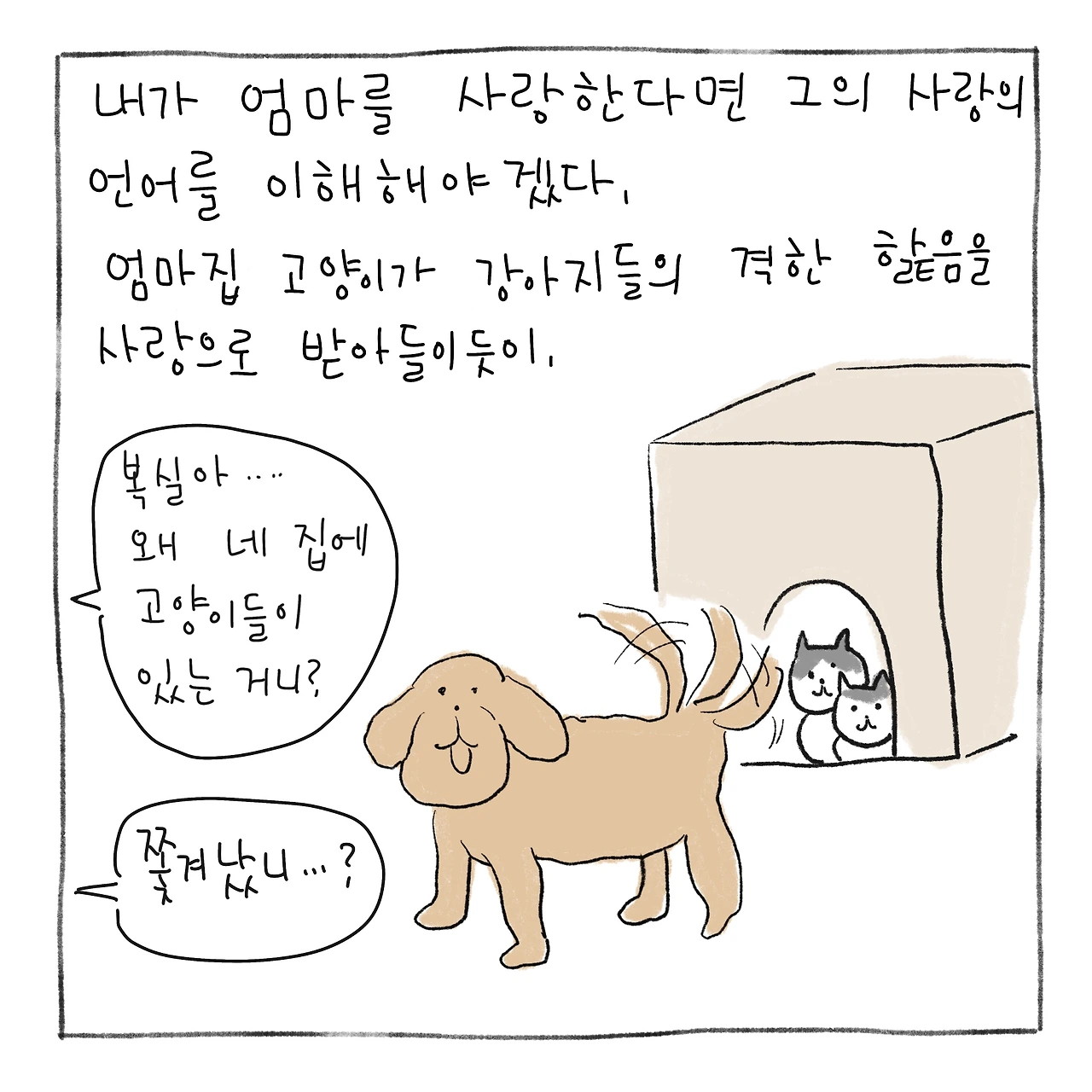 내가 엄마를 사랑한다면 그의 사랑의 언어를 이해해야겠다. 엄마잡 고양이가 강아지들의 격한 핥음을 사랑으로 받아들이듯이.