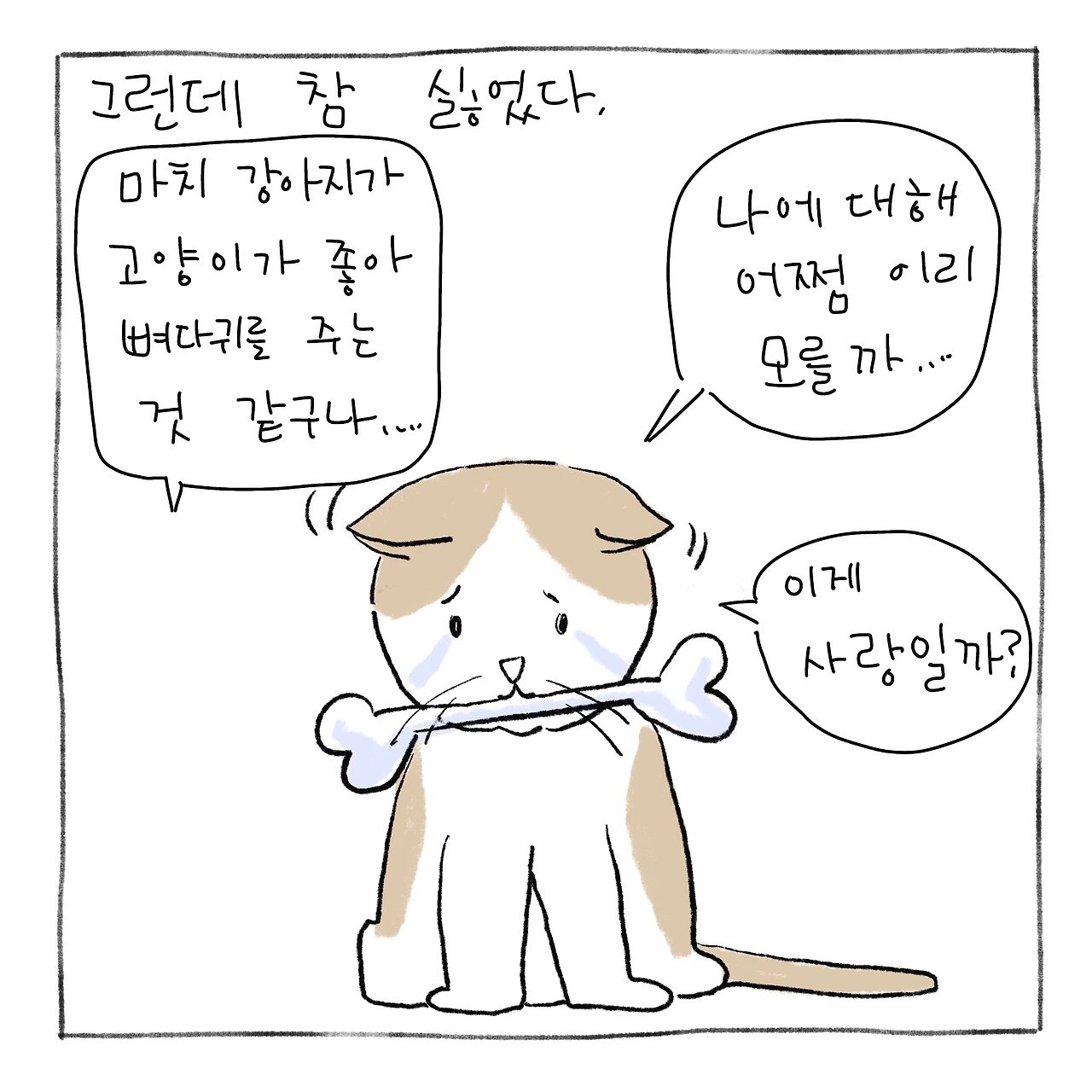 ’마치 강아지가 고양이가 좋아 뼈다귀를 주는 것 같구나.. 나에 대해 어쩜 이리 모를까.. 이게 사랑일까?“