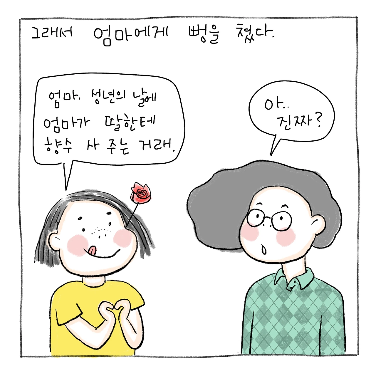 “엄마, 성년의 날에 엄마가 딸한테 향수 사 주는 거래. ”